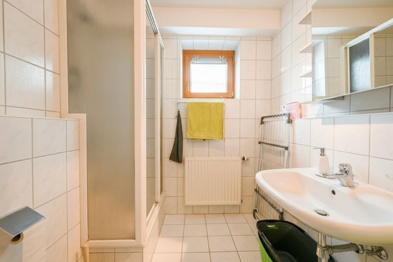 Badezimmer mit WC, Dusche, Anschluss für die Waschmaschine und Fenster.