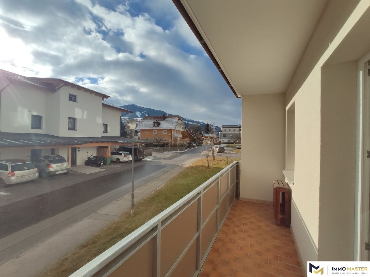 Die Wohnung befindet sich im leicht erreichbaren ersten Halbstock und genießt gleichzeitig die Vorzüge einer vom großen Wohnzimmer begehbaren sonnigen Loggia mit Bergblick. Auf der Loggia haben eine Sitzgarnitur, ein Tisch und ein Kästchen ausreichend Platz.