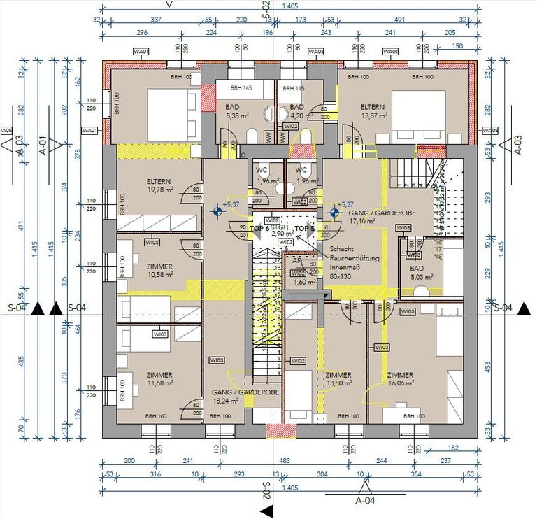Ebene 1- Garderobe - separates WC - Abstellraum - Bad - 2 Zimmer - Schlafzimmer