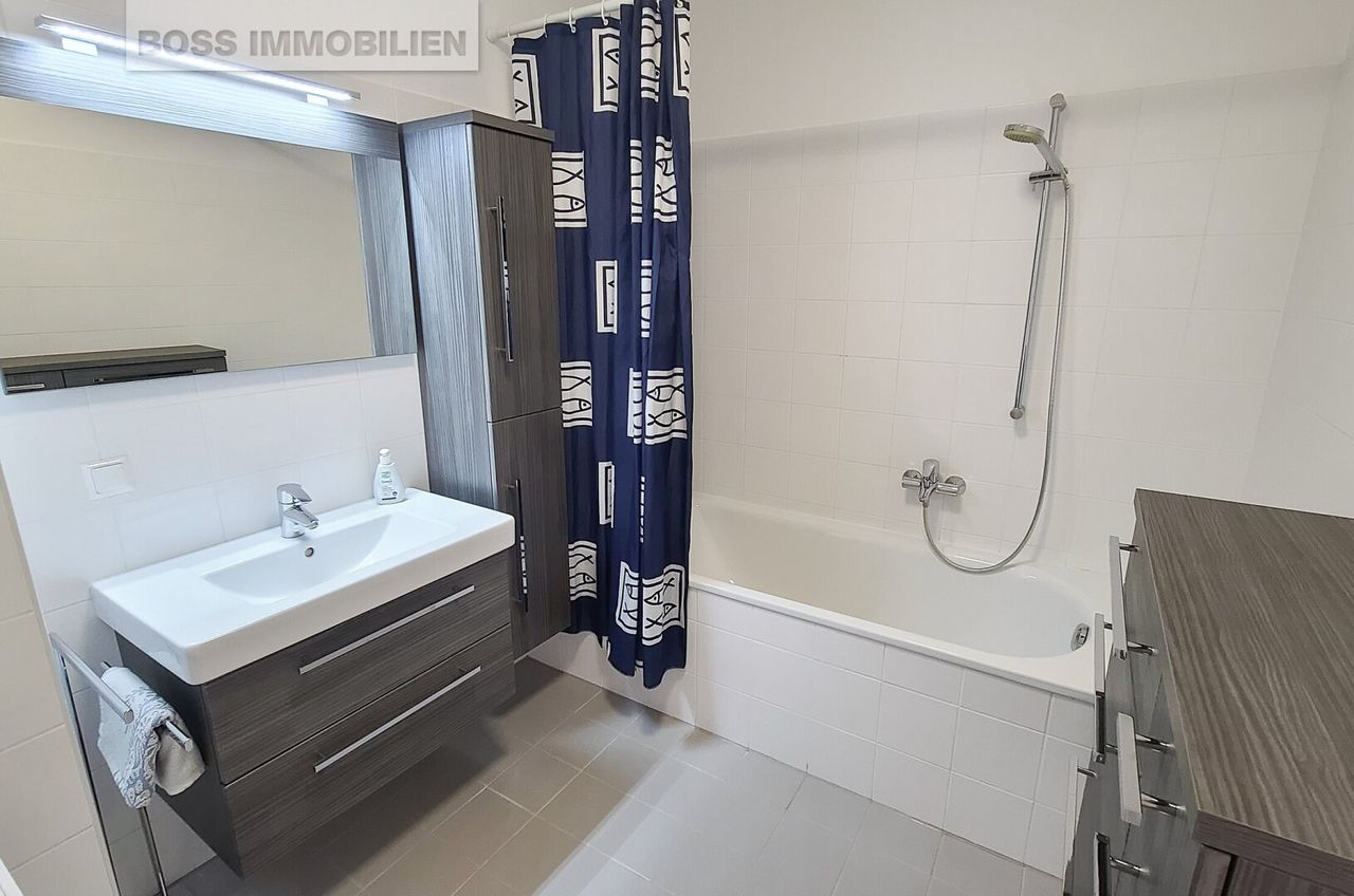 Das modern verflieste Badezimmer mit Badewanne lädt zu entspannten Auszeiten ein.