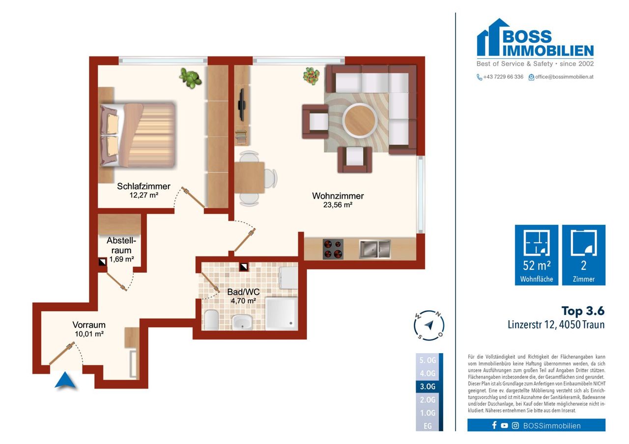 Der Grundriss überzeugt mit Klarheit und Funktion: Ein einladendes Wohn-Esszimmer mit integrierter Küchenzeile bildet das Herzstück der Wohnung. Dazu kommen ein großzügiges Schlafzimmer, ein modernes Badezimmer mit Dusche und WC sowie ein praktischer Abstellraum für alles, was gut verstaut sein will. Große Fensterflächen lassen viel Tageslicht herein und schaffen eine freundliche, offene Atmosphäre.
