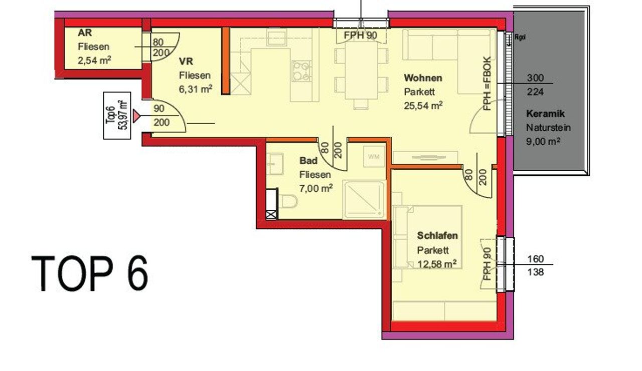 Vorraum - Abstellraum - Wohnküche - Bad mit WC – Schlafzimmer – Terrasse