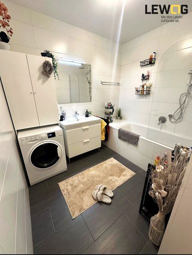 Die moderne Wohnküche ist praktisch gestaltet und verfügt über einen angrenzenden Abstellraum. Das Schlafzimmer mit ca. 14m² bietet ebenfalls einen direkten Zugang zu Terrasse und Garten. Das Badezimmer ist mit Badewanne inkl. Duschtrennwand und Waschtisch ausgestattet, das WC inkl. einem kleinen Handwaschbecken ist separat. Im Bad haben die aktuellen Mieter einen Waschtisch-Unterschrank samt Spiegel montiert, hierfür wäre eine Ablöse von 180,- Euro geplant.