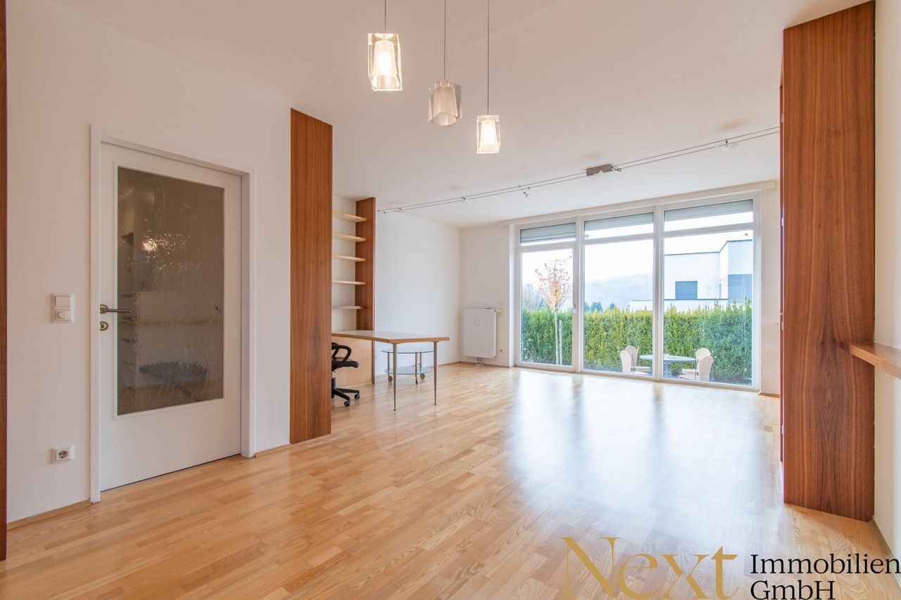 Der offen gestaltete, lichtdurchflutete Wohn- und Essbereich verfügt über eine vollausgestattete Einbauküche. Große, bodentiefe Fensterfronten sorgen für ein helles Ambiente und führen direkt auf die sonnige Terrasse (inklusive elektrisch betriebener Markise) sowie in den begrünten Eigengarten.