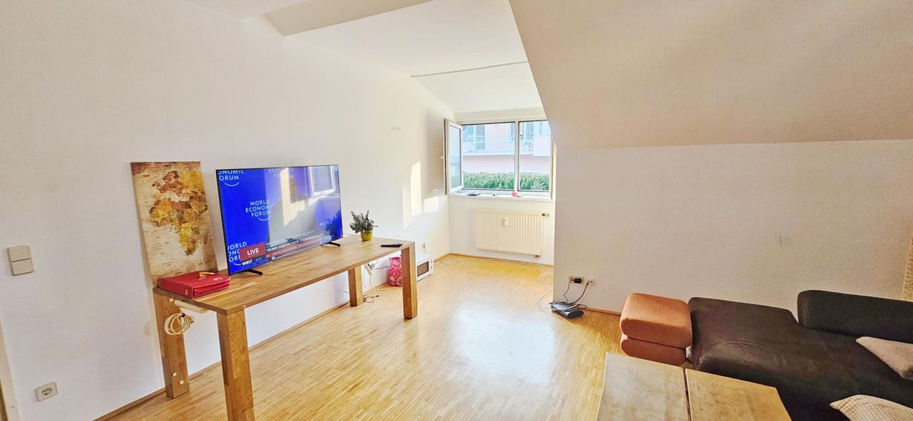 Das großzügige, helle Wohnzimmer lädt zum Verweilen ein, während das Schlafzimmer mit charmanter Dachschräge für eine gemütliche Atmosphäre sorgt. Hochwertige Parkettböden sowie eine Klimaanlage unterstreichen den Wohnkomfort.