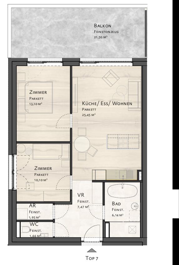 • Geräumige Ess-Wohnküche mit Balkonzugang