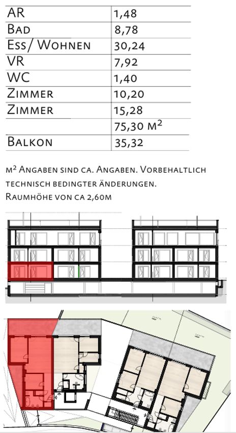 Diese 3-Zimmer-Mietwohnung befindet sich im Erdgeschoss und verfügt über zwei Balkone mit Ausrichtung nach Norden und Osten. Die Wohnfläche beträgt ca. 75 m², ergänzt durch großzügige Balkonflächen von insgesamt ca. 35 m².