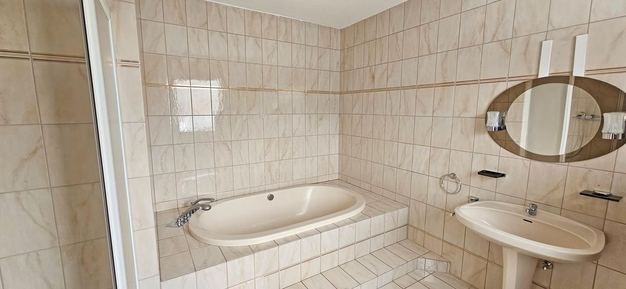 Das Badezimmer ist mit einer Badewanne und Dusche ausgestattet, ein separates WC ist vorhanden.
