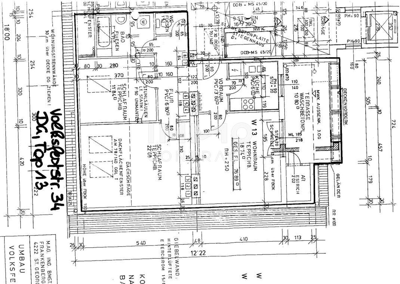 Raumaufteilung: Vorraum, Bad , WC, Küche, Wohn-Esszimmer, 2 Schlafzimmer, Dachterrasse mit Abstellraum.