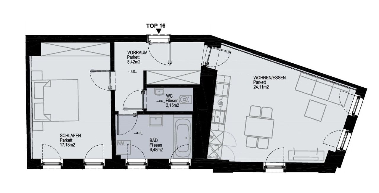 RAUMAUFTEILUNG: - Vorraum - Bad - WC - Wohn-/Ess-/Kochbereich - Schlafzimmer