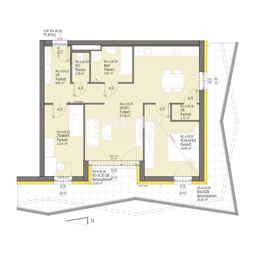 Raumaufteilung: Wohnküche (ablösefreie Einbauküche) , optisch getrennter Wohnbereich, zwei Schlafzimmer, elegantes Bad, WC und Abstellraum.