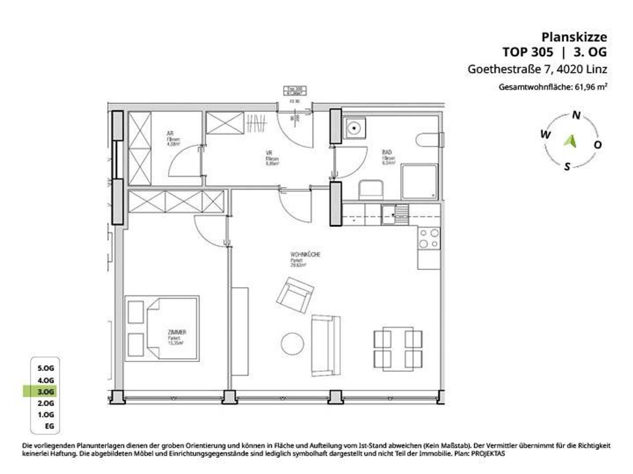 Diese helle 2 Zimmerwohnung befindet sich im dritten Stockwerk (mit Lift) des Hauses Goethestraße 7 in Linz und ist ab April 2026 verfügbar.