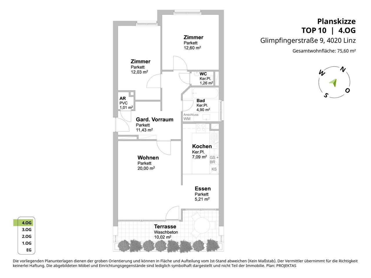Raumaufteilung der ca. 75,60 m² (mit Lift in den Halbstock):