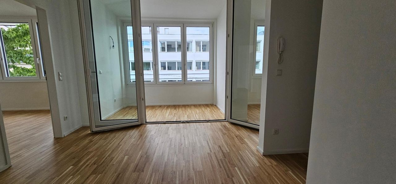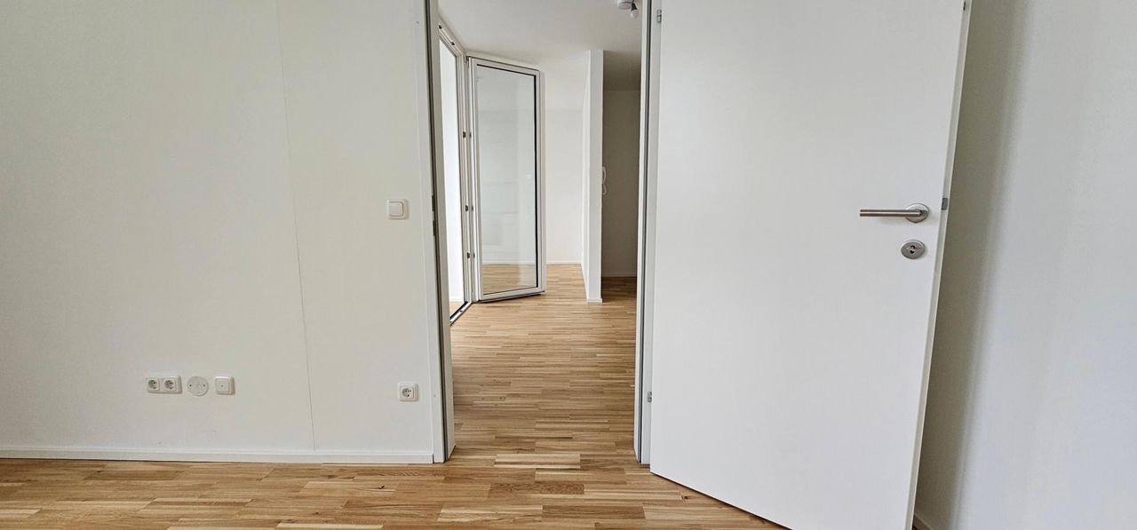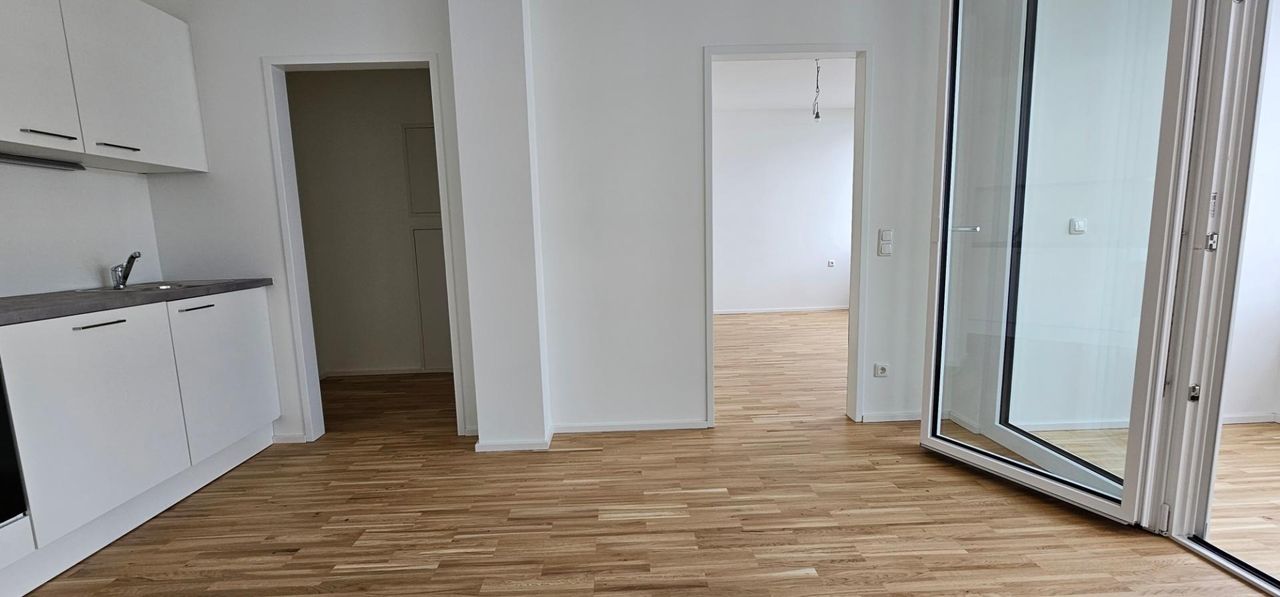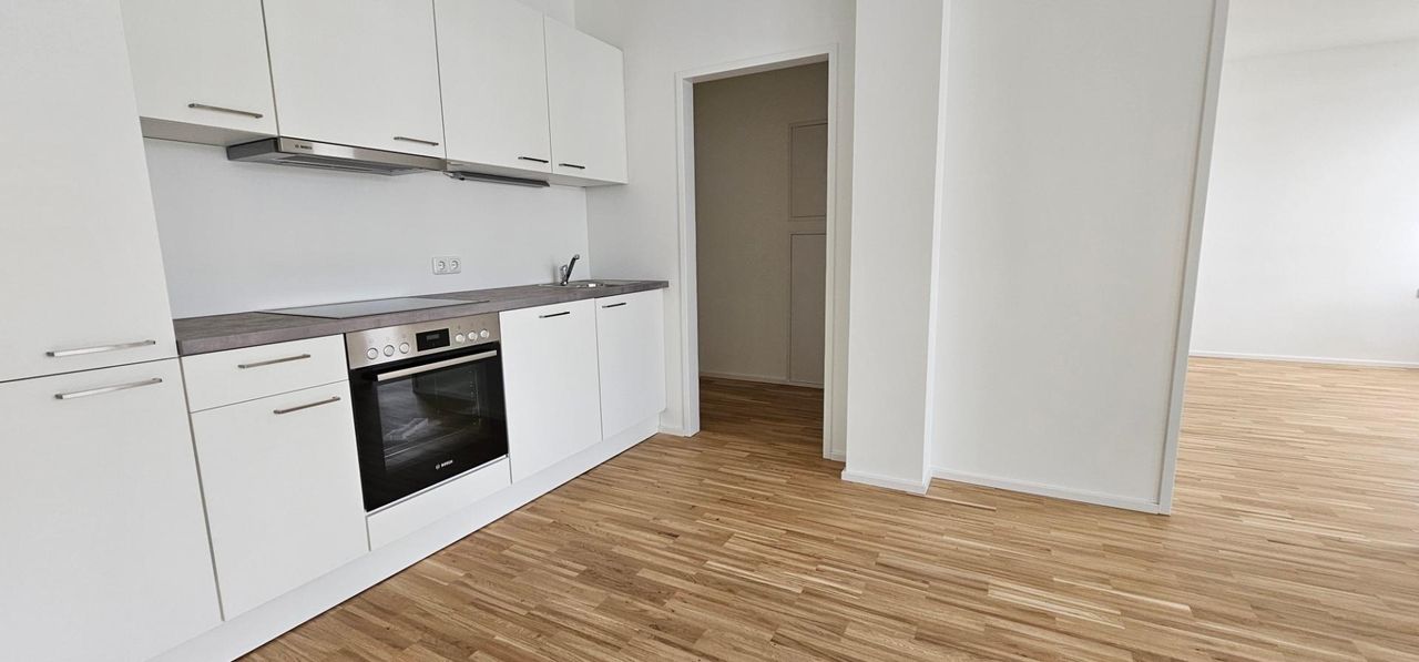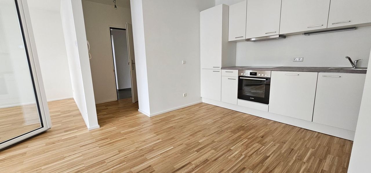 Helle Neubauwohnung (Sanierung 2024) mit Schlafzimmer und möblierter Küche.