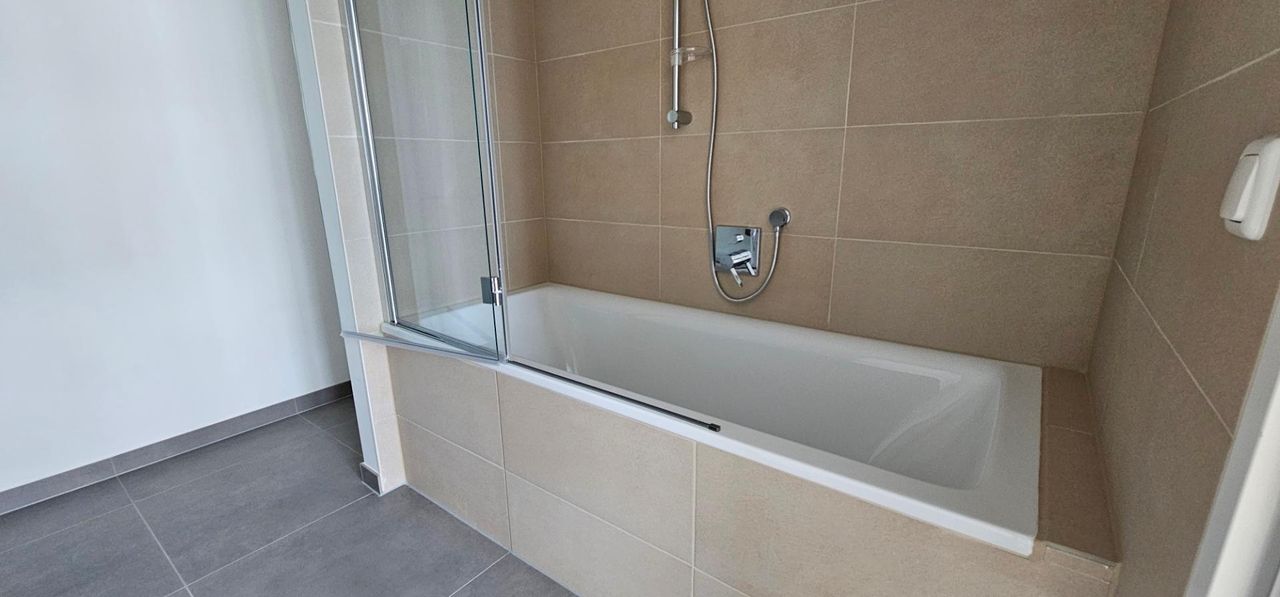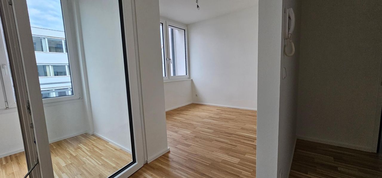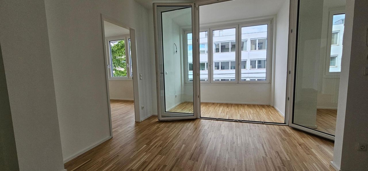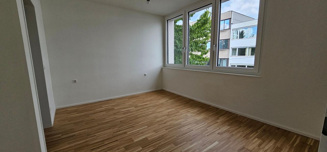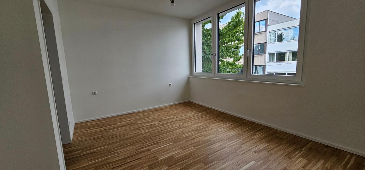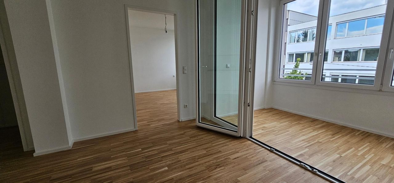 Helle Neubauwohnung (Sanierung 2024) mit Schlafzimmer und möblierter Küche.