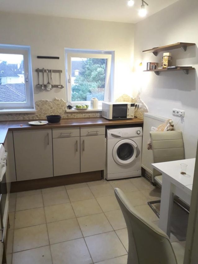 Über den Flur gelangen Sie in die möblierte Küche mit Waschmaschine sowie in das gemütliche Wohnzimmer, das mit einem L-Sofa, einer Wohnwand und einem Couchtisch ausgestattet ist.