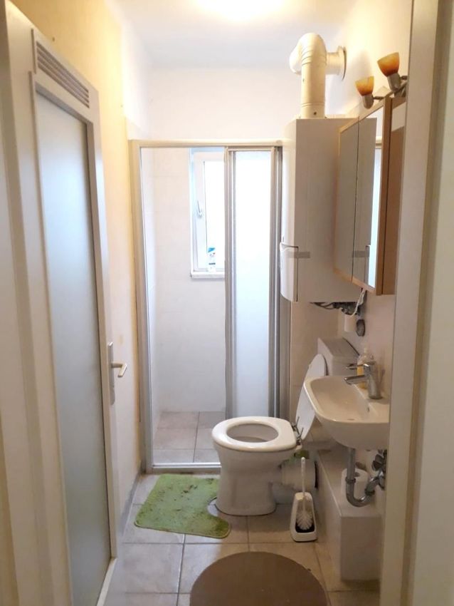 Das Badezimmer verfügt über eine Dusche und ein WC. Vom Wohnzimmer aus erreichen Sie das möblierte Schlafzimmer mit Bett und Kleiderschrank.