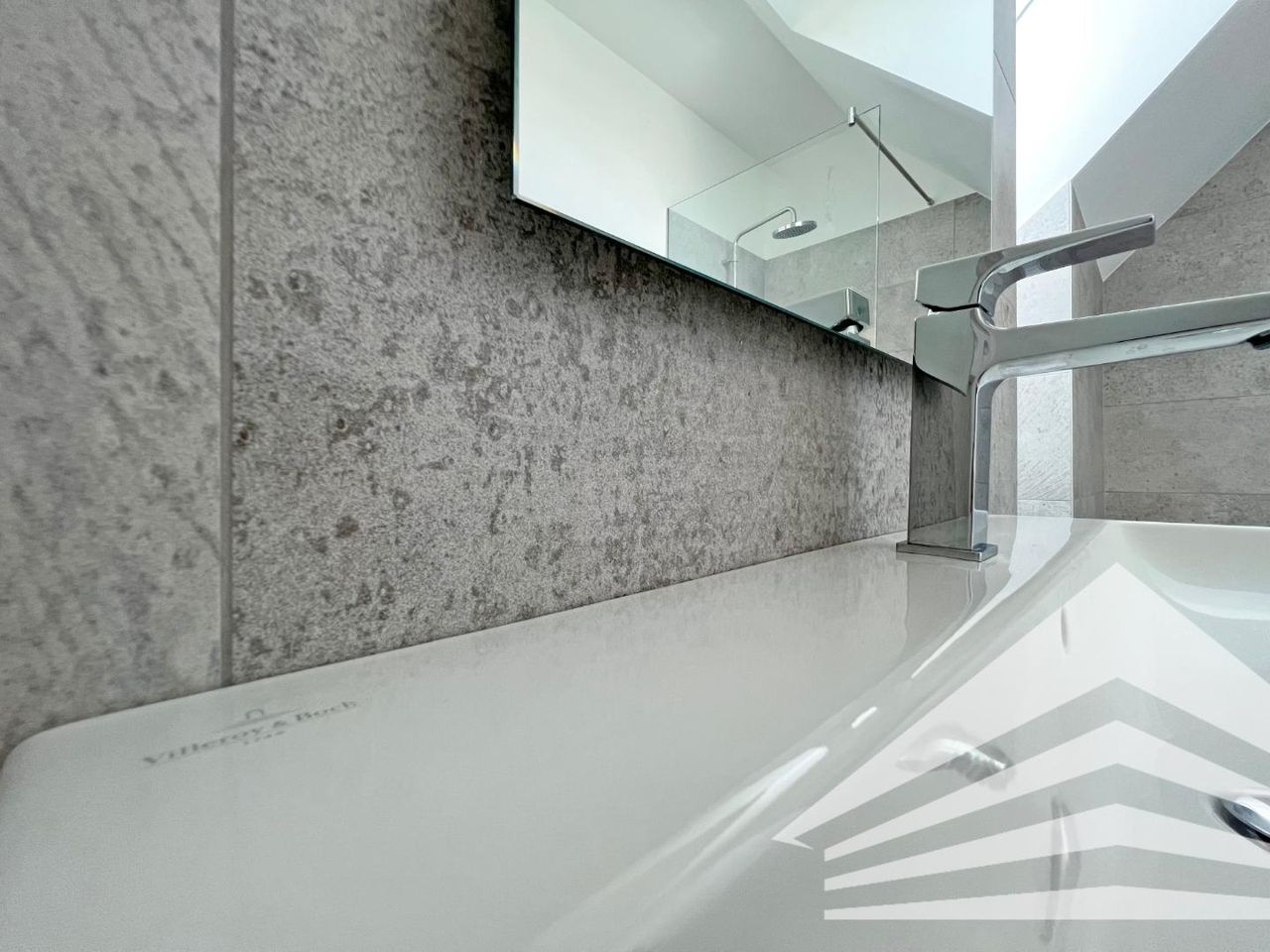 - Modernes Bad inkl. Waschbeckenverbau und Designerspiegel mit Wanne und WC im DG