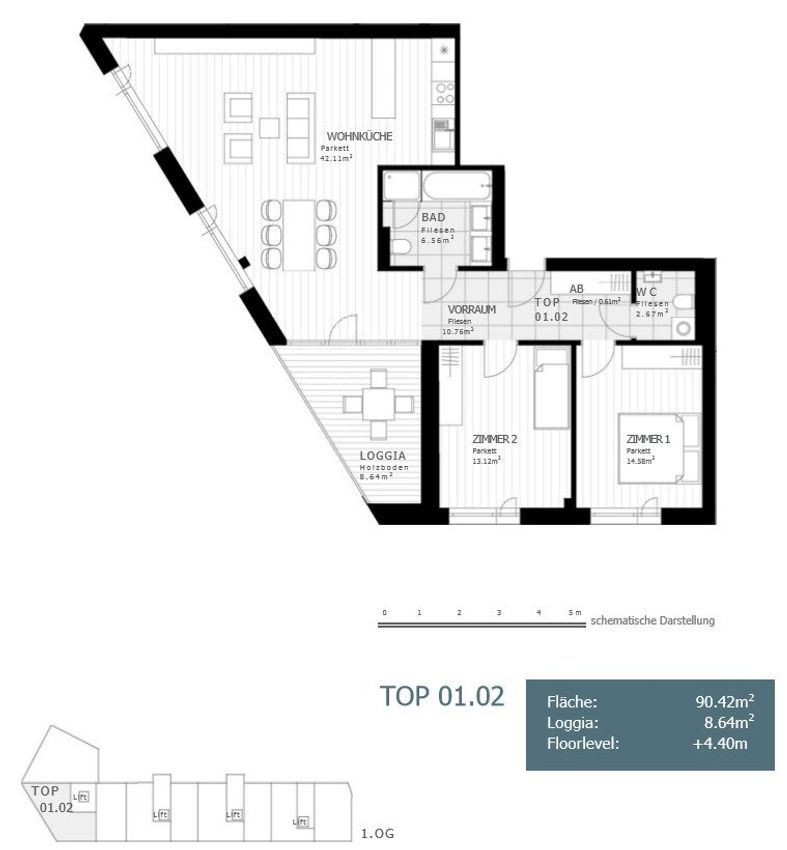 Die Wohnung besticht durch eine helle und offene Wohnküche, die viel Raum für gemeinsames Kochen und gemütliche Abende bietet. Die offene Gestaltung schafft eine einladende Atmosphäre, in der Sie sich sofort wohlfühlen werden. Von hier aus gelangen Sie direkt auf die Loggia, die zum Entspannen im Freien einlädt – ideal für Ihren Morgenkaffee oder einen lauen Sommerabend.