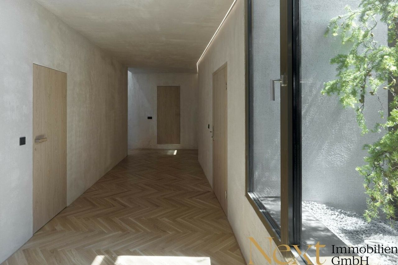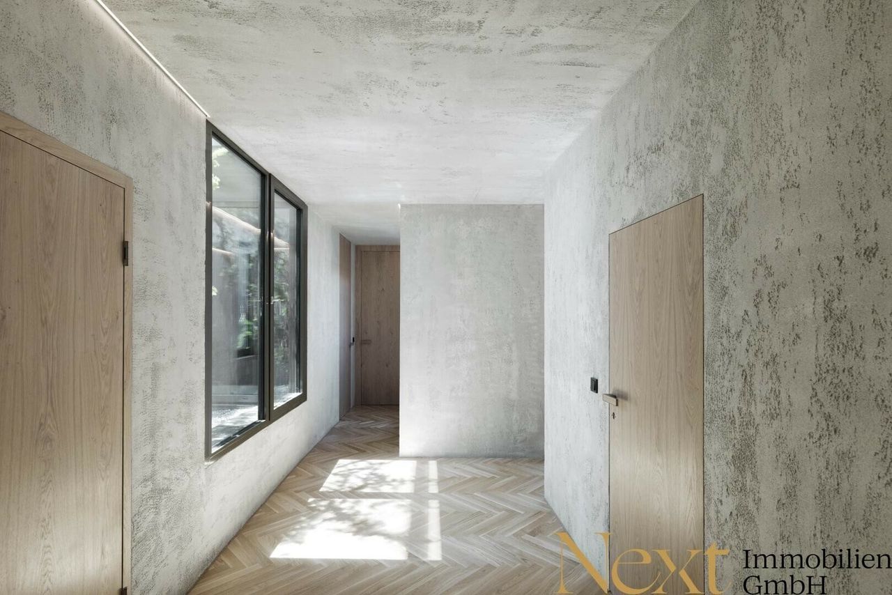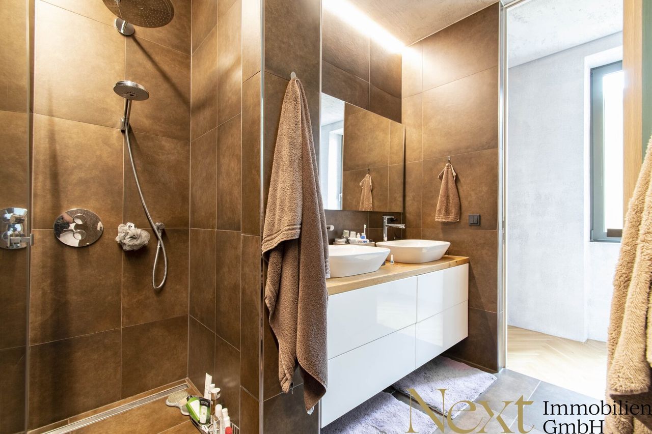 Luxuriöses Ambiente, welches zeitlosem, modernem Design und hochwertig verbauten Materialien zu verdanken ist, findet sich in allen Wohn- als auch Sanitärräumen wieder. Grauer, porös strukturierter Verputz bedeckt die Wände und ein hochwertiger Eichen Fischgrät-Boden sorgt für einen historischen Charakter.