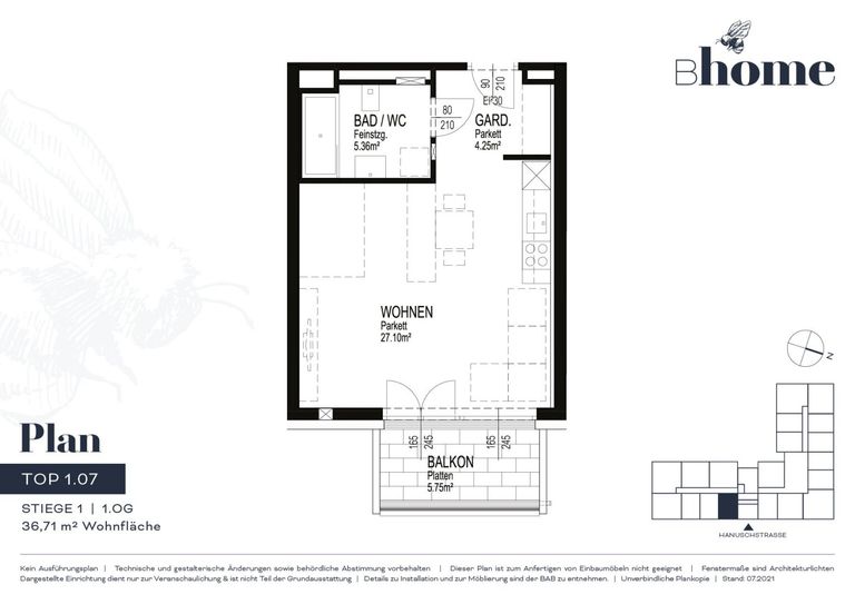 Diese optimal aufgeteilte, ca. 36,71m² große Wohnung befindet sich im 1. Obergeschoß und ist sowohl barrierefrei mittels Lift als auch über das Stiegenhaus erreichbar. Ein besonderes Highlight dieser 1-Zimmer-Wohnung ist der ca. 5,75m² große, ostseitig ausgerichtete Balkon.