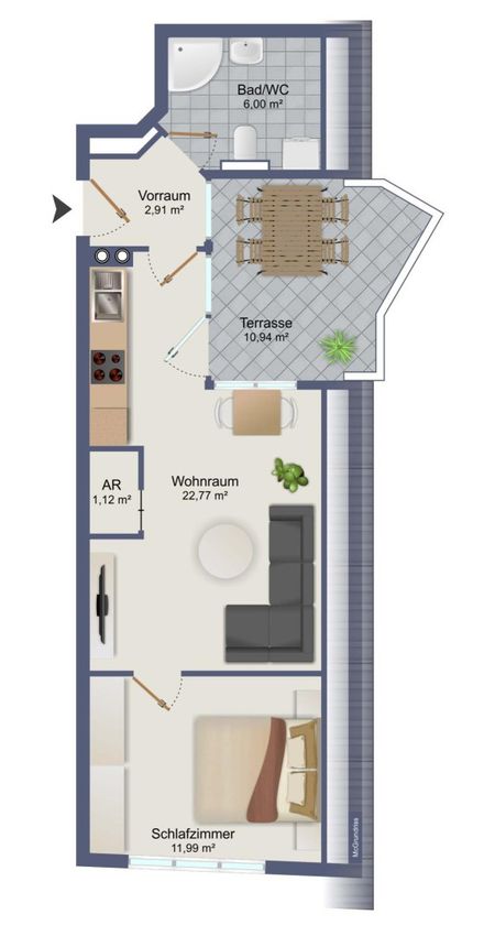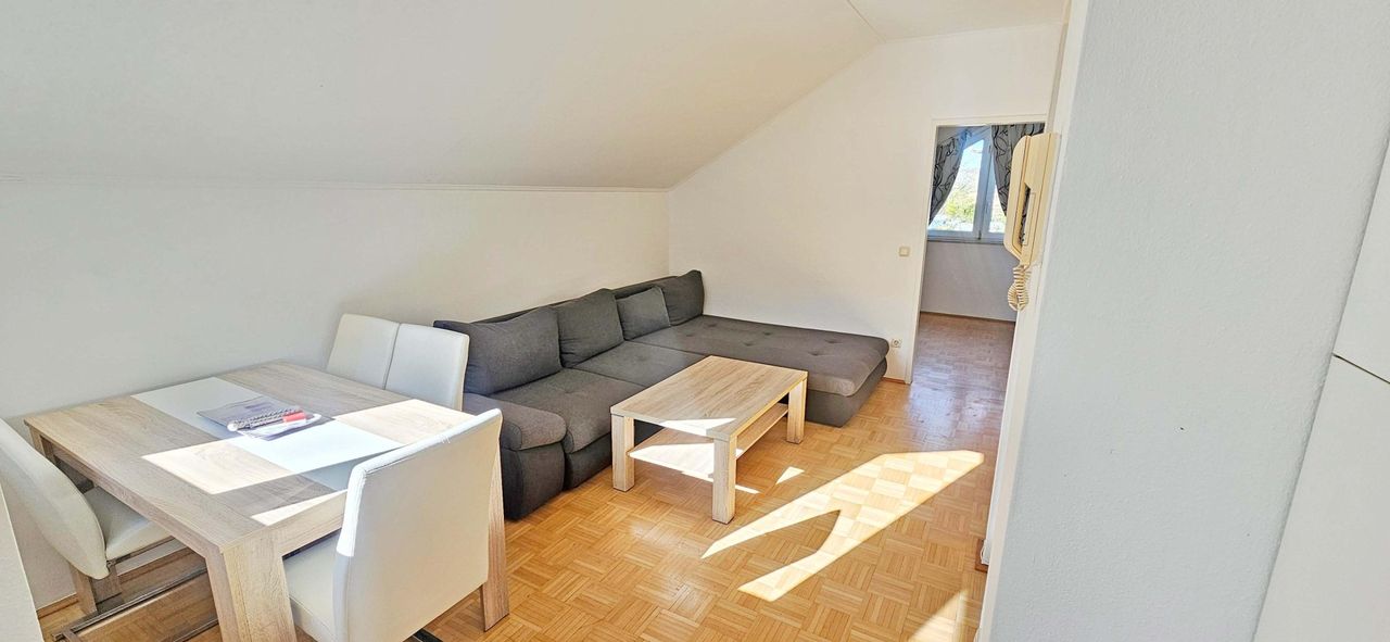 Der offen gestaltete Wohnbereich umfasst eine helle Wohnküche mit direktem Zugang zur Dachterrasse. Die Küche ist vollständig möbliert und im Mietpreis inkludiert. Ergänzt wird die Wohnung durch ein gemütliches Schlafzimmer, einen zentralen Vorraum, ein Badezimmer mit Dusche, WC und Waschmaschinenanschluss sowie einen praktischen Abstellraum.