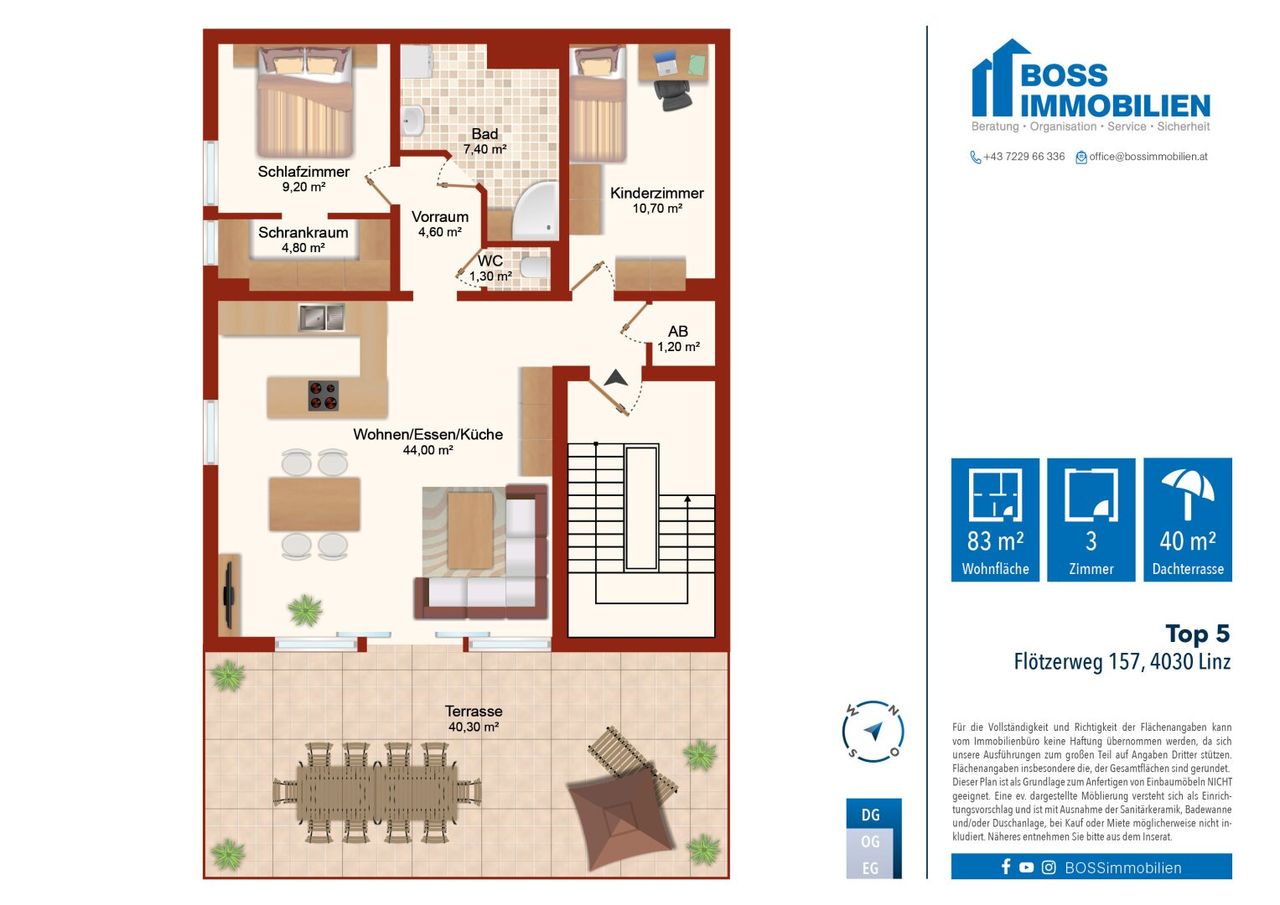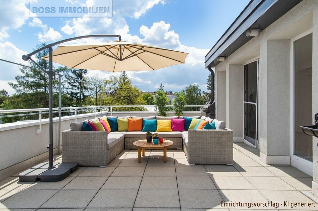 Das Herzstück dieser Wohnung ist die rund 40 m² große, östlich ausgerichtete Terrasse, die Ihren Wohnraum ins Freie erweitert. Ob beim entspannten Sonnenbaden...