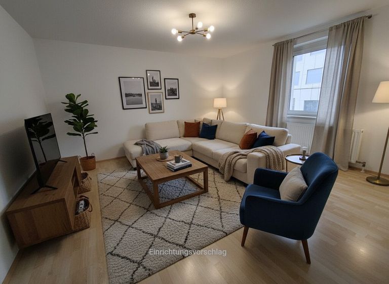 Die Wohnung empfängt Sie mit einem hellen und freundlichen Ambiente. Hier können Sie Ihre Abende gemütlich verbringen und Ihre Gäste willkommen heißen. Das Wohnzimmer bietet genügend Platz für eine bequeme Couch und einen Essbereich, während das separate Schlafzimmer eine ruhige Rückzugsmöglichkeit darstellt.