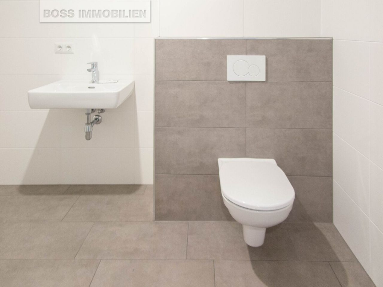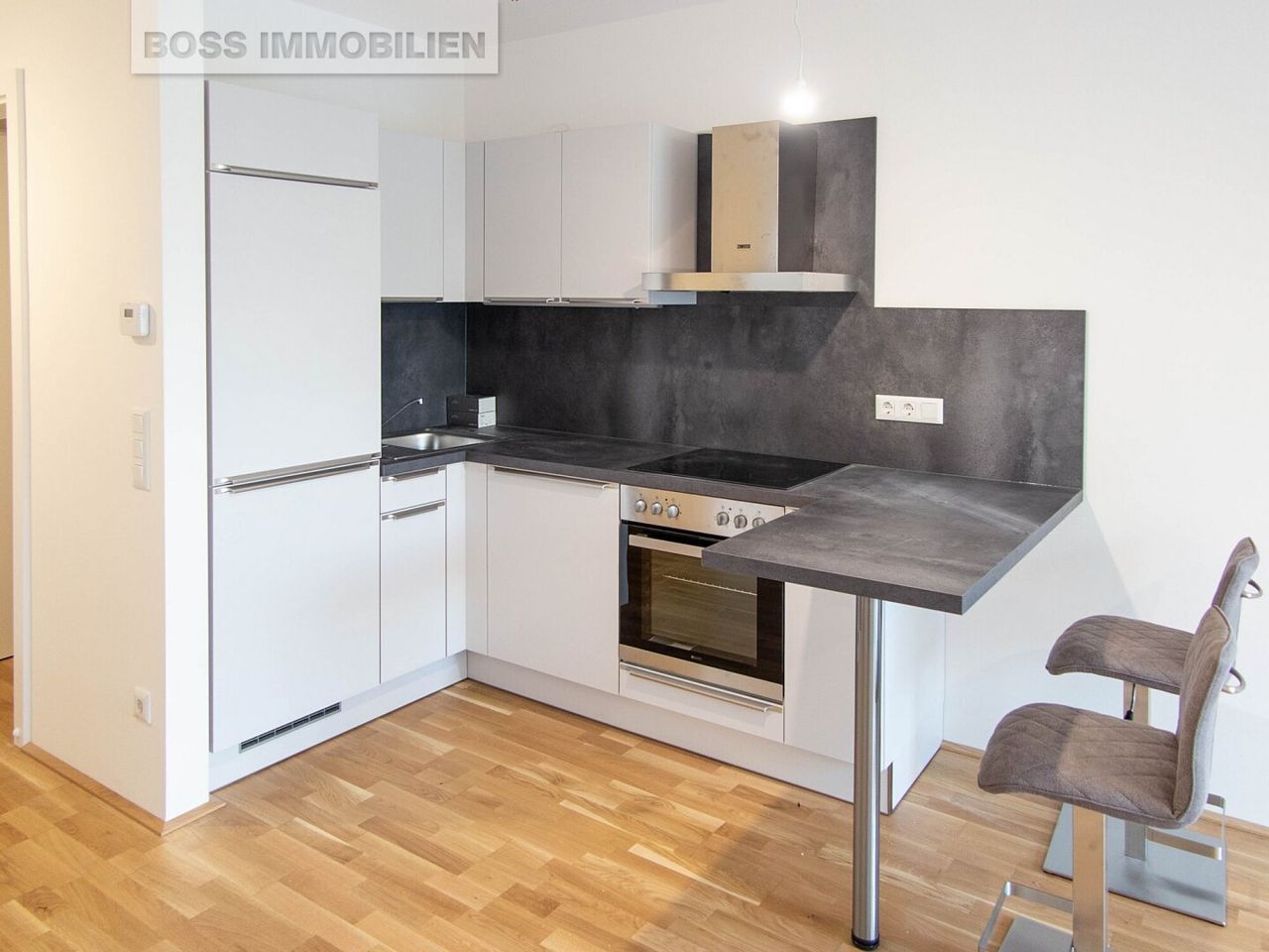 Die elegante Küche ist mit E-Geräten ausgestattet und integriert sich harmonisch in den offenen Wohnbereich. Der Essplatz ist clever in die Küche integriert und schafft so zusätzlichen Raum für den gemütlichen Wohnbereich. Das modern geflieste Badezimmer verfügt über eine geräumige Dusche. Die Küche ist Bestandteil der Wohnung und wird mit vermietet.
