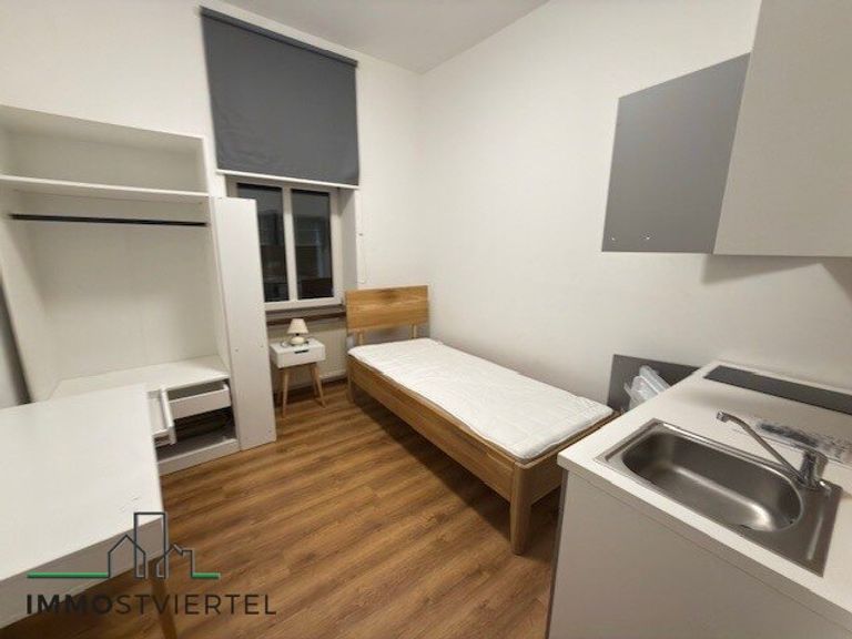 * Möbliert mit Bett, Schrank, Tisch samt Stühlen, Kleiderschrank