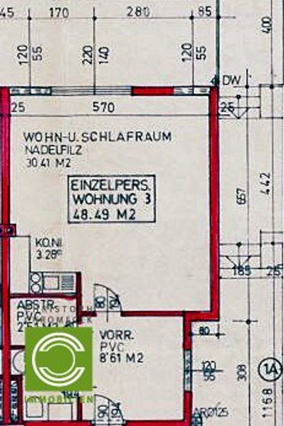 Zur Vermietung auf zunächst 5 Jahre (Verlängerung möglich) steht ab sofort eine zentrumsnah gelegene Einraumwohnung in einer gepflegten kleinen Wohnhausanlage. Die Wohnung liegt im 1. Stock (kein Aufzug) und besteht aus einem zentralen Vorraum mit einem großen Schrank und einer Garderobenwand, einem Badezimmer mit Toilette und kleiner Wanne / Dusche, einem geräumigen Anstellraum mit Stellagen sowie einem großen Wohn-Schlafraum mit integrierter Küchenecke. Beheizt wird mit einer Hauszentralheizung. Die Fenster sind aus Kunststoff und doppelt verglast. Zum weitern Umfang dieser Wohnung gehört ein helles und trockenes Kellerabteil mit ca. 4 m². Zur allgemeinen Nutzung steht auch noch ein Fahrrad- und Kinderwagenabstellraum zur Verfügung.
