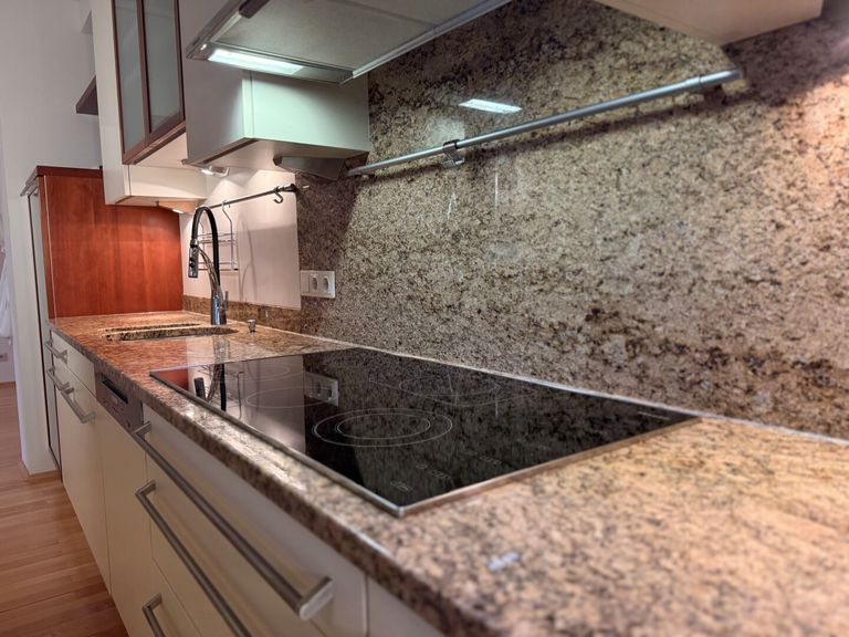 Die moderne Wohnküche mit hochwertiger Echtstein-Arbeitsplatte ist nicht nur ein Blickfang, sondern auch absolut alltagstauglich: viel Arbeitsfläche, durchdachter Stauraum und Platz für ambitionierte Kochabende ebenso wie für das schnelle Glas Wein nach einem langen Tag. Der Essbereich ist großzügig, hell und perfekt für lange Abende, einen großen Esstisch und Gäste, die eigentlich nur „kurz vorbeischauen“ wollten.