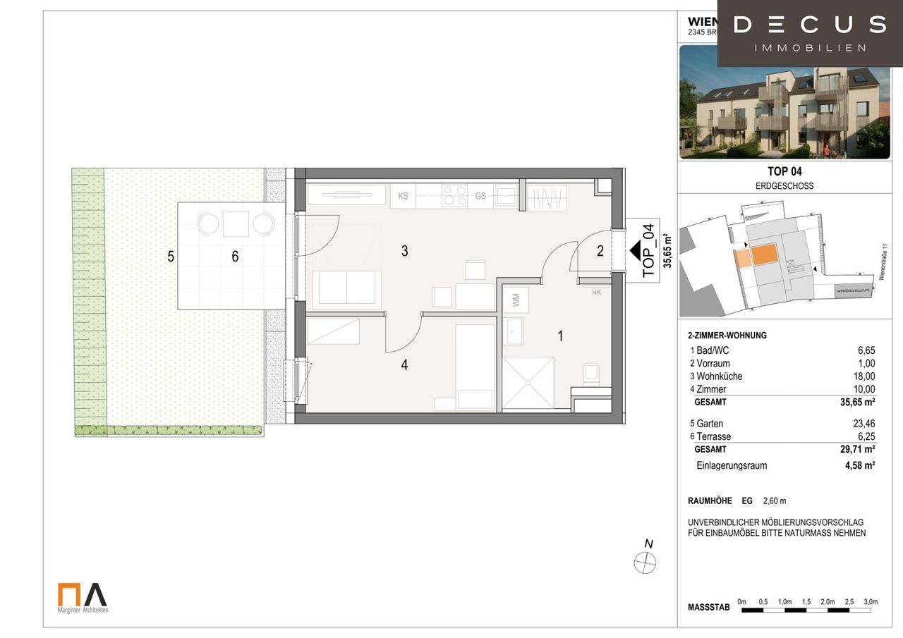 Top 04 befindet sich im Erdgeschoß, ist westlich ausgerichtet und teilt sich wie folgt auf: