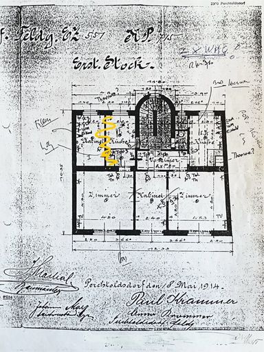Ein zentraler Korridor führt zum Stiegenaufgang. Im ersten Stock befindet sich der Wohnungseingang. Hier gibt es 4 Zimmer. Das geräumige Vorzimmer bietet Zugang zu einem der beiden gestaltungsthematisch unterschiedlichen Wohnsalone, zum Esszimmer (mit Balkon), zum Schlafzimmer sowie in die separate Küche (Einbauküche mit allen Geräten). Der zweite Wohnsalon ist vom Esszimmer sowie vom Schlafzimmer aus zu betreten, das Schlafzimmer ist sowohl von zweiten Wohnsalon also auch dem Vorraum zu betreten. Die beiden Wohnsalone sowie das Esszimmer mit dem charmanten Balkon sind straßenseitig angeordnet. Das Schlafzimmer ist gartenseitig (Rückseite) ausgerichtet. Ein WC mit Waschbecken ist vom Vorraum aus zu betreten.