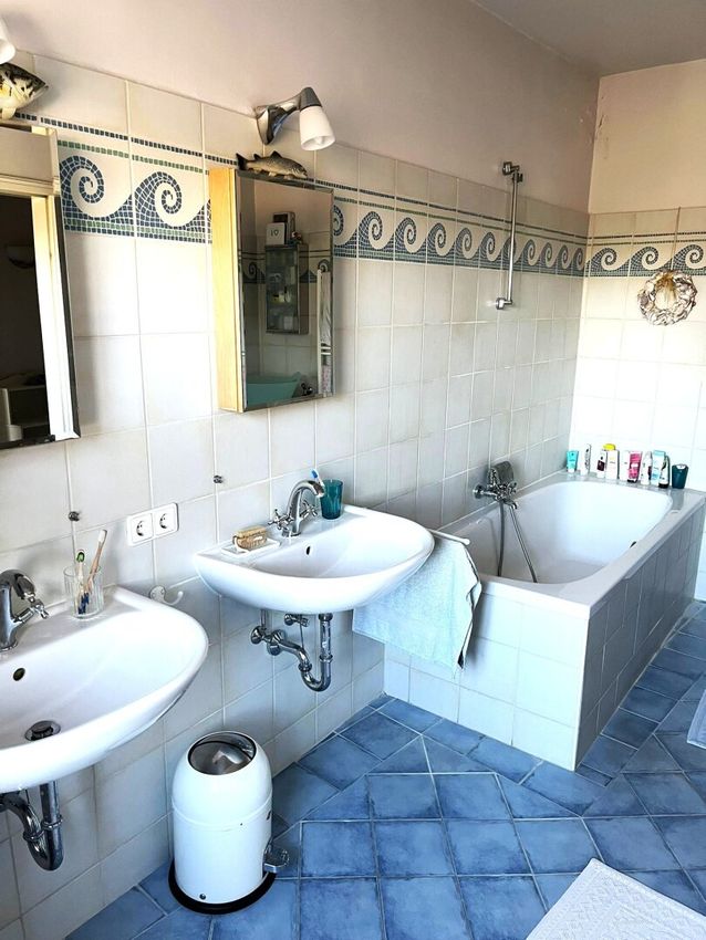 Vom Vorraum führte eine Treppe ins 2. OG. Da befinden sich 2. weitere Schlafzimmer sowie ein Bad mit 2 Waschbecken und Badewanne, sowie ein separates WC. Eines dieser beiden Schlafzimmer hat Dach-Loft-Charakter mit sichtbarer Dachstuhl-Struktur.