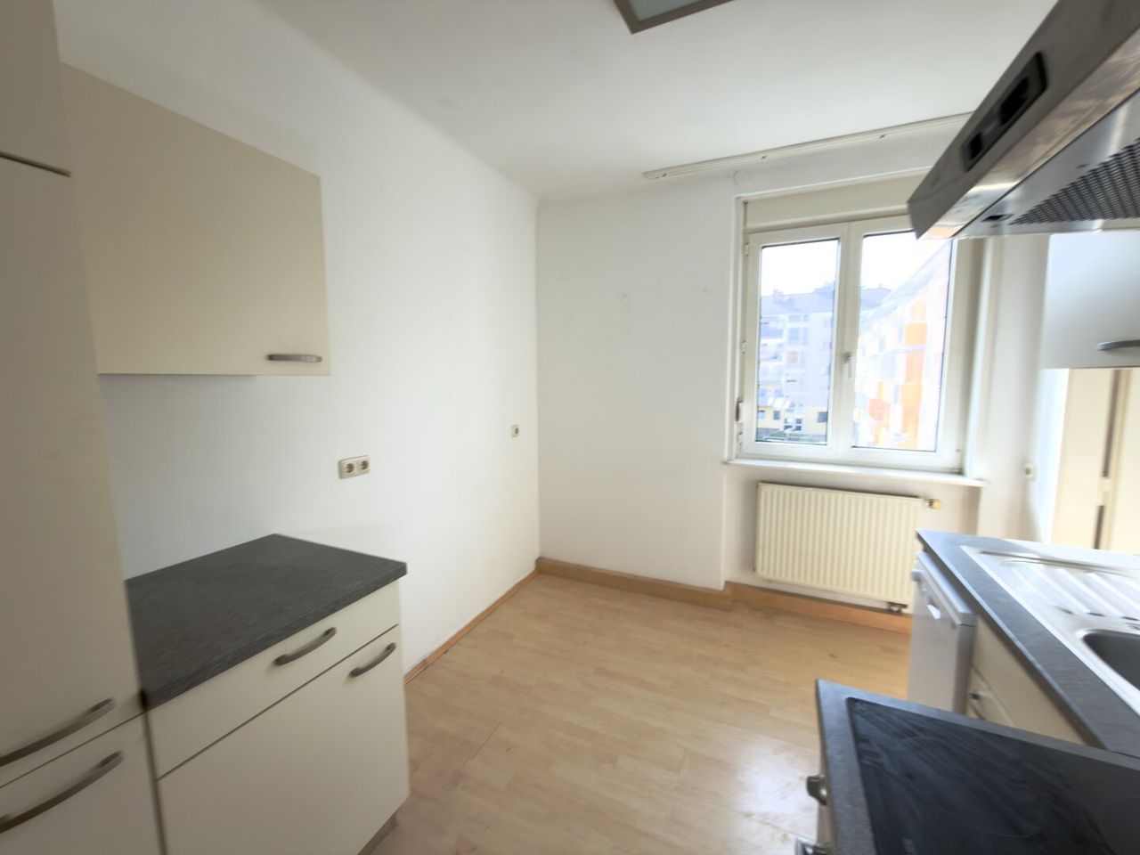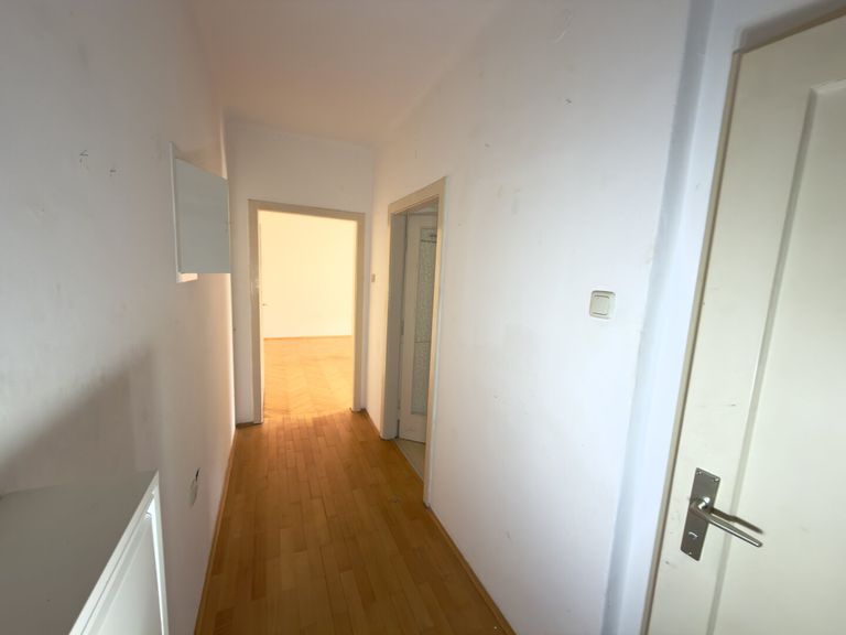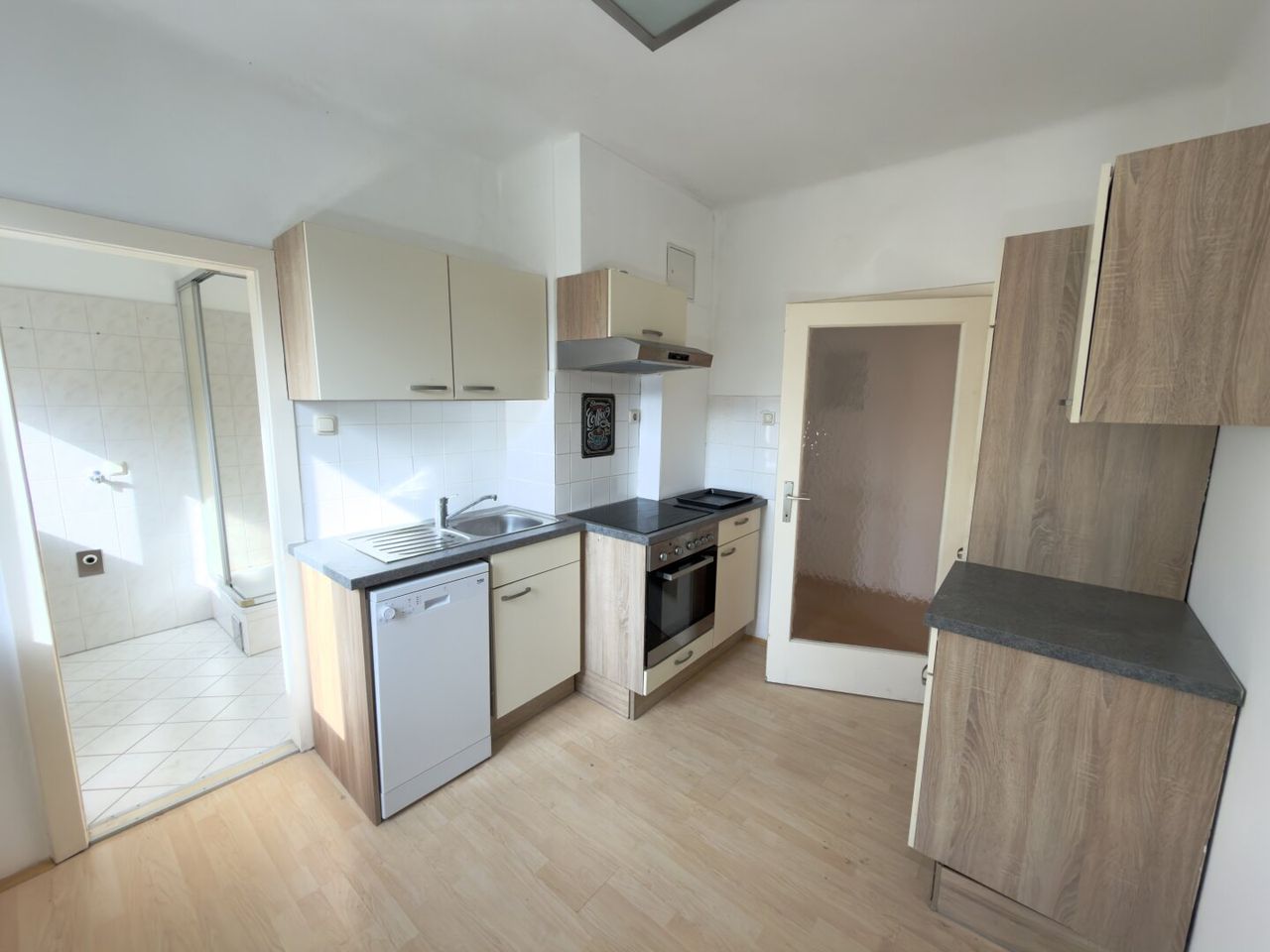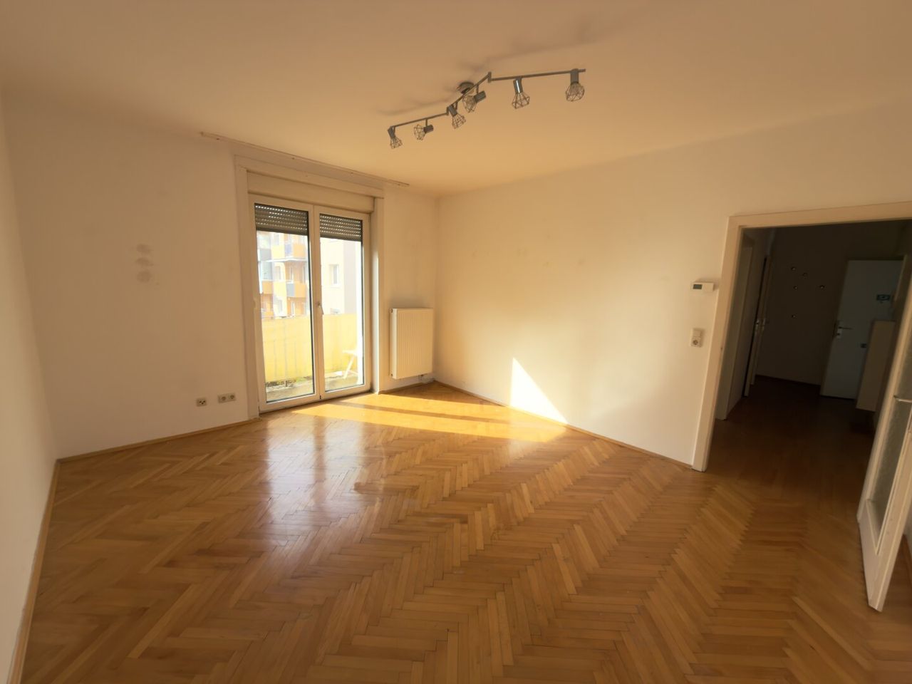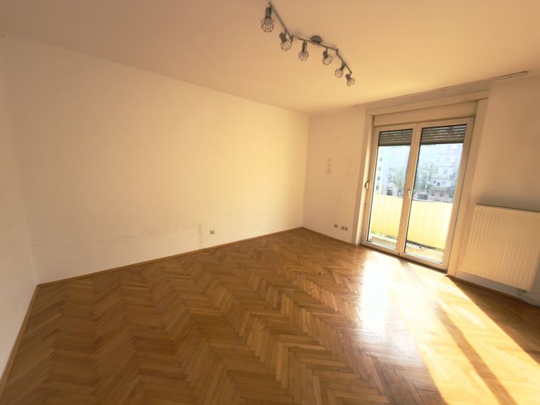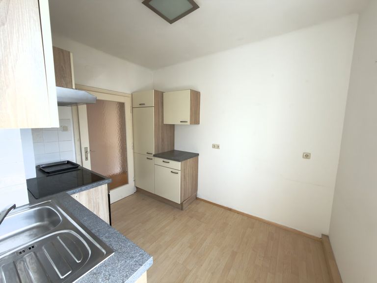 Die Wohnung besticht durch einen durchdachten Grundriss mit einem großzügigen Wohnraum, der durch den Parkettboden eine warme und einladende Atmosphäre schafft. Die möblierte Küche mit Platz für einen Essbereich ist in einem separaten Raum zugänglich.