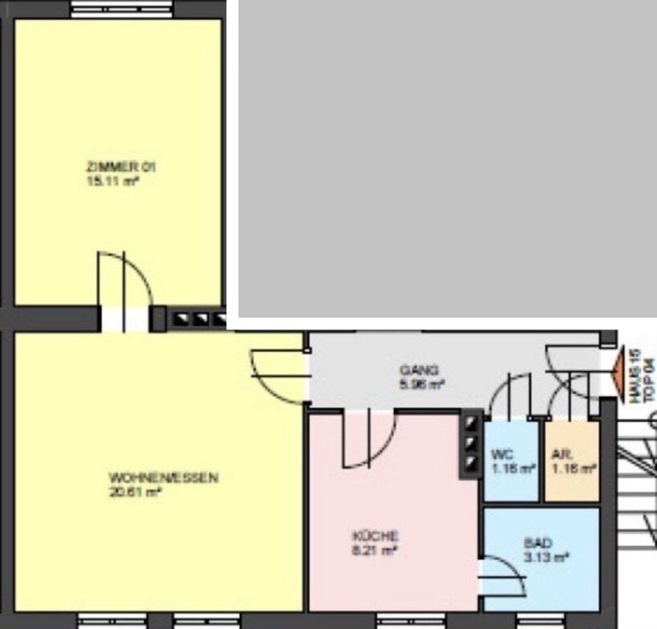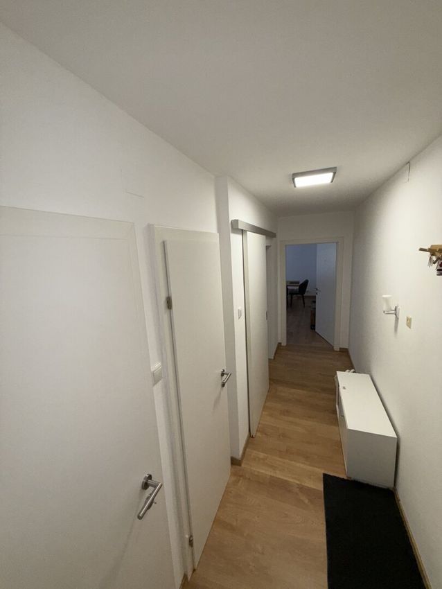Die Wohnung besteht aus einem Vorraum, einem Abstellraum, einem WC, einem Badezimmer, einer Küche mit Wohn- und Essbereich sowie zwei Schlafzimmern.