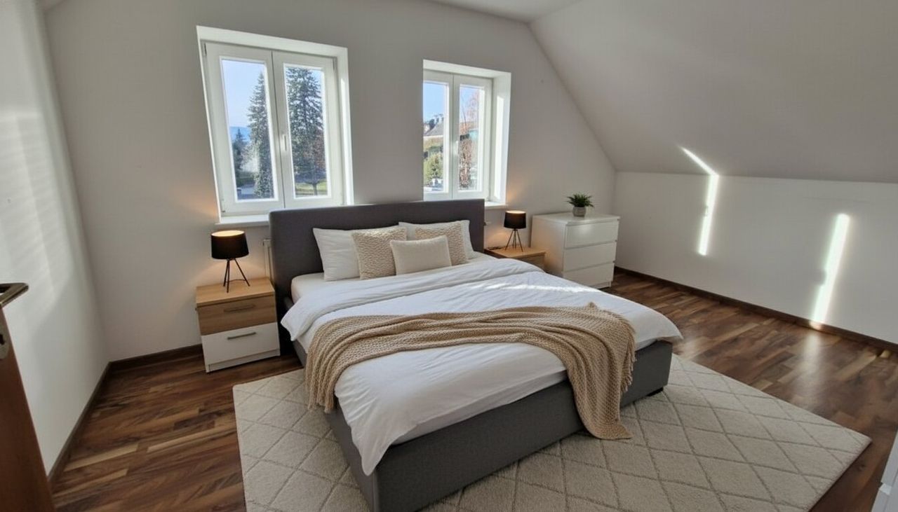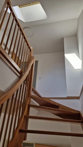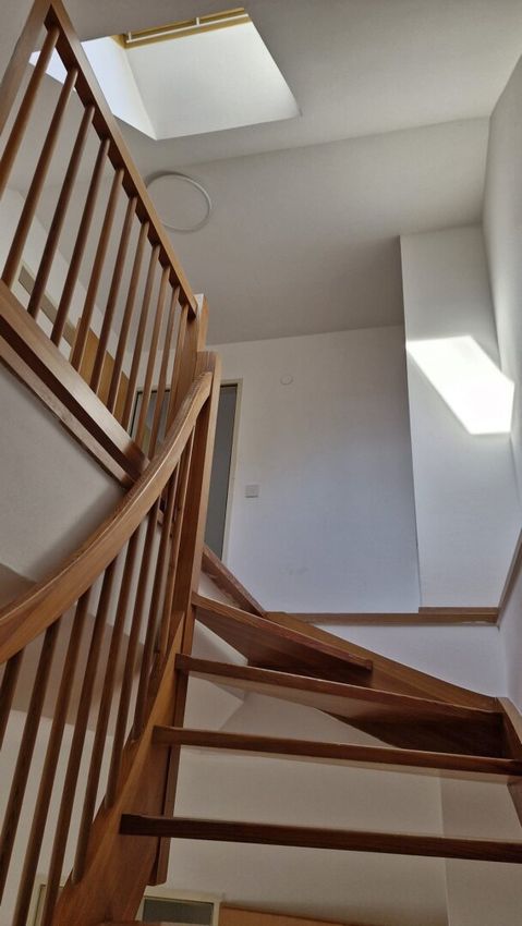 Über eine Holz-Innentreppe erreicht man das Obergeschoss, in dem sich das Badezimmer, ein Schlafzimmer und ein zusätzlicher Abstellraum befinden.