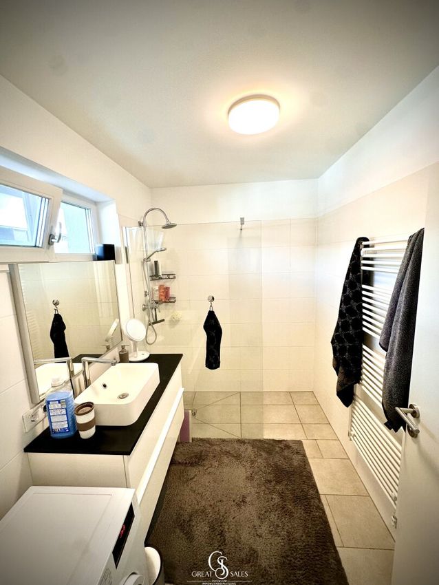 - Badezimmer mit Dusche, Waschbecken, elektrischen Handtuchwärmer und Waschmaschinenanschluss