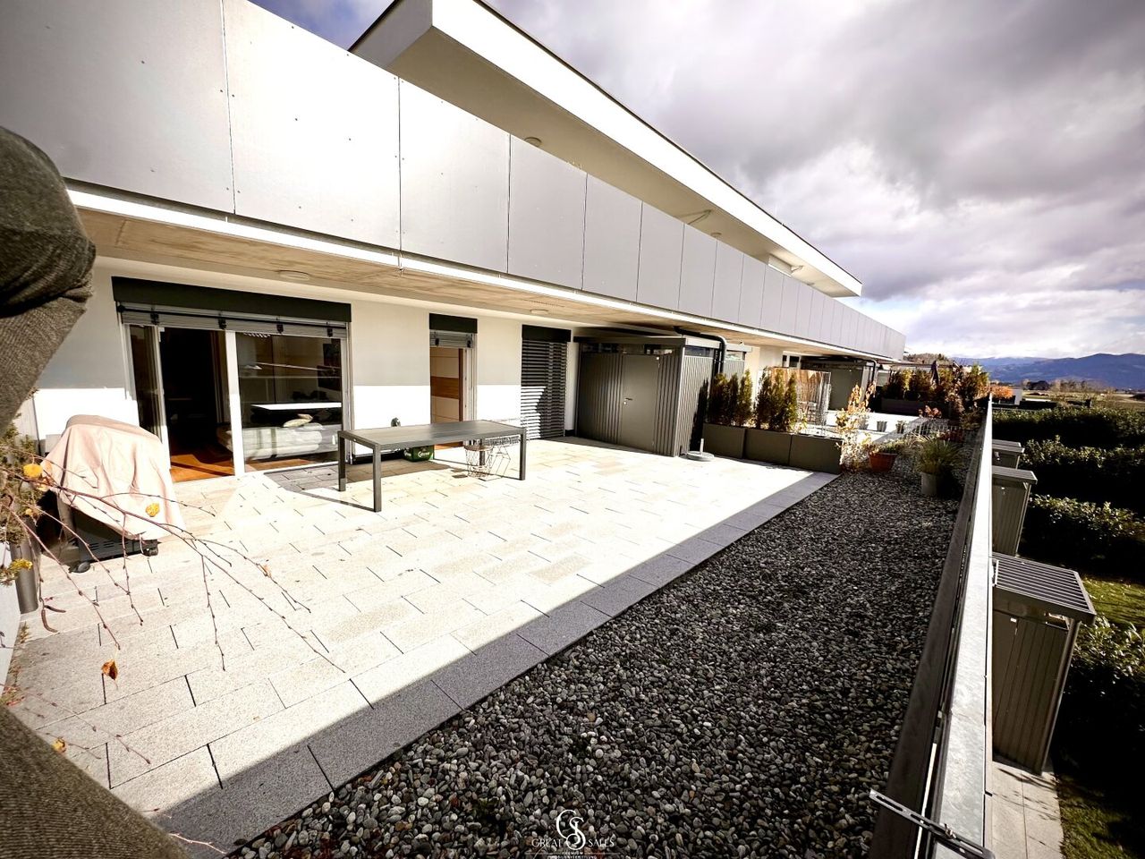Sie zeichnet sich besonders durch große Fensterflächen, lichtdurchflutete Räume sowie einer optimalen Raumaufteilung aus. Ein absolutes Plus bietet zusätzlich die riesige, mit Feinsteinzeug verlegte und barrierefrei zugängliche Terrasse mit mit einem privaten Gartenanteil, welcher keine Wünsche offen lässt.