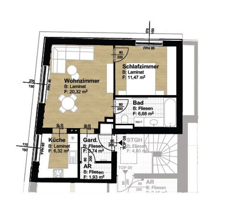 Die Nassräume, Abstellräume und der Eingangsbereich sind mit hochwertigen Fliesen und die Wohnräume mit eleganten Dekor Eiche Laminat ausgestattet.