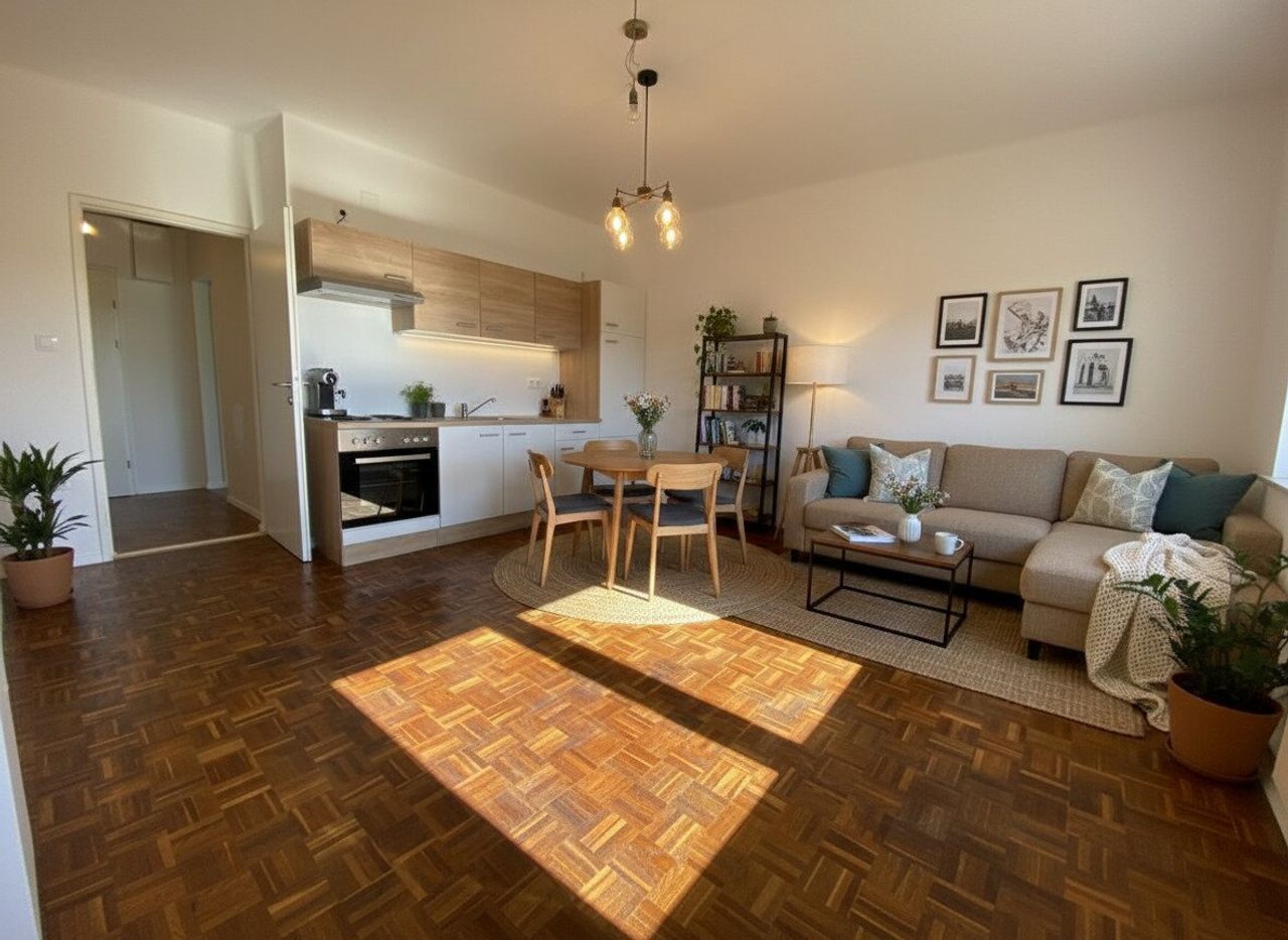 Bei den Fotos handelt es sich um Originalfotos, darauffolgend KI generierte Einrichtungsvorschläge. Die Wohnung wird inklusive Küche, ansonsten unmöbliert übergeben.