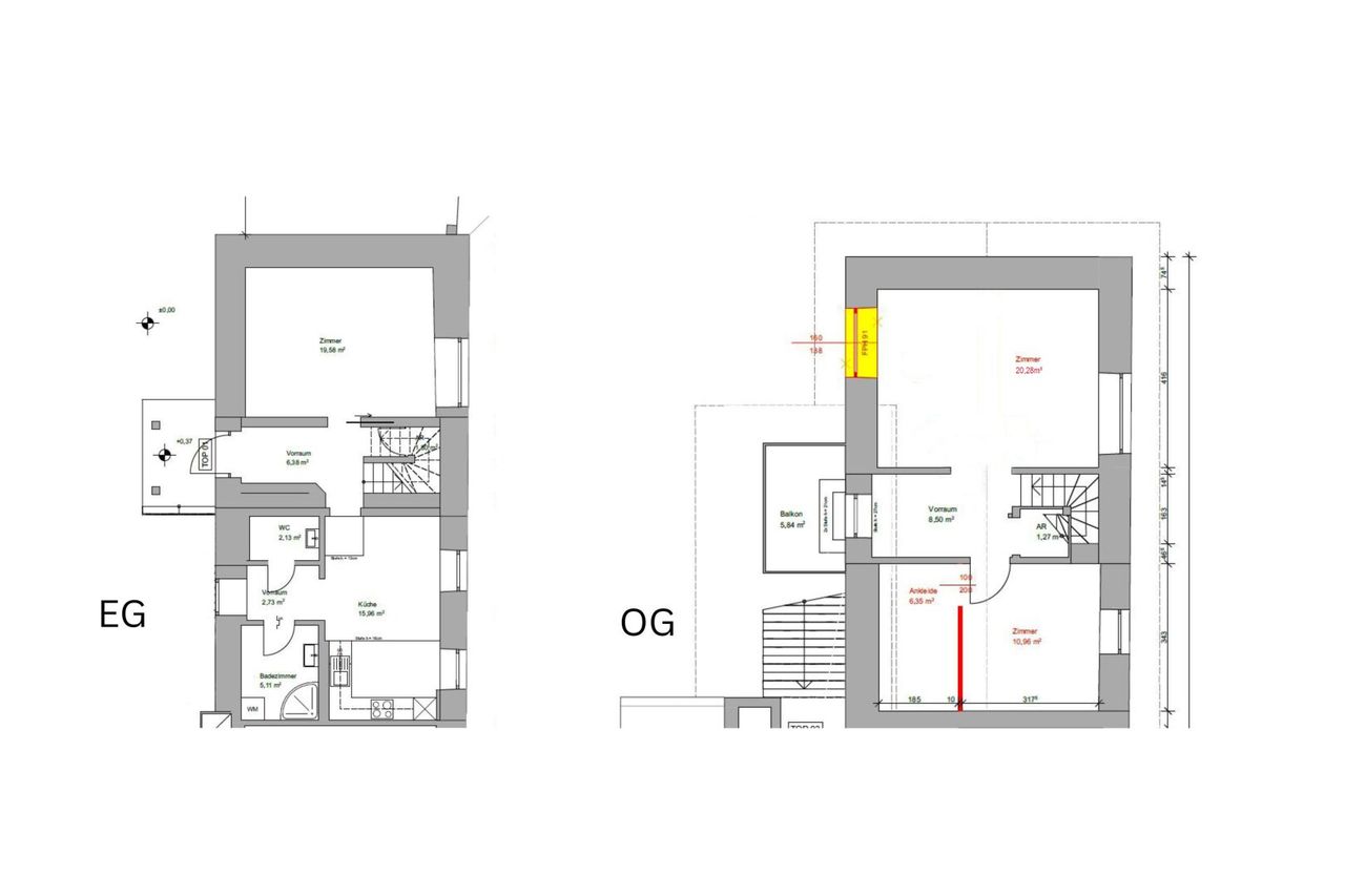 Die Wohnung besticht durch ihre Raumaufteilung auf 2 Etagen. Eine großzügige Küche mit Essgruppe, sowie 3 separat begehbare Zimmern – ideal als Wohn- und Schlafbereiche oder für Homeoffice. Das Duscvhbad ist getrennt vom WC. Im Obergeschoss kommt man vom Vorraum auf den großen Balkon mit Blick in den Garten