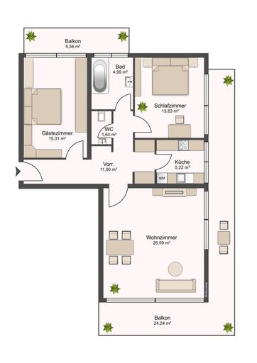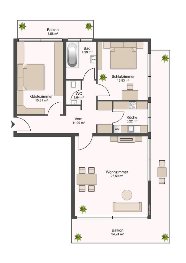 Alle Daten wurden mit Sorgfalt erhoben, die angegebenen Maße sind gerundet. Für die Richtigkeit und Vollständigkeit ist der Auftraggeber verantwortlich. Wir weisen ausdrücklich darauf hin, dass an der Wohnung Sanierungsbedarf besteht und die aktuelle Wohnungsaufteilung nicht dem Einreichplan sowie dem Nutzwertgutachten entspricht. Der Einrichtungsvorschlag wurde mit KI generiert.