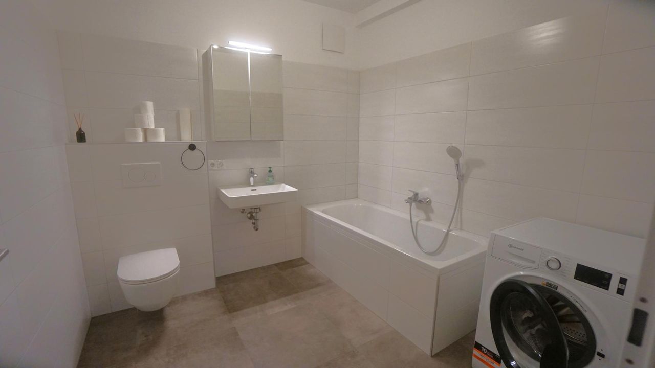 - Bad mit Badewanne, WC, Waschbecken und Waschmaschinenanschluss.