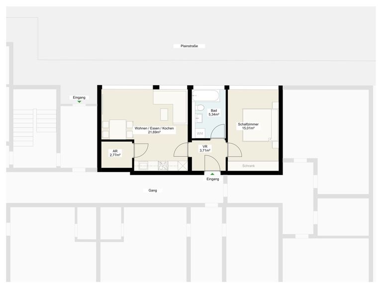 Eben modernisiert, überzeugt durch ihre geschmackvolle Ausstattung in hellem Design – ein angenehmes Wohnambiente ist garantiert. Vom Vorraum sind der großzügig gestaltete helle Wohn-, Ess- und Kochbereich mit gemütlichem Flair sowie auch das Bad/WC und das gut geschnittene Schlafzimmer begehbar. Das zeitlos-moderne, hell gestaltete Bad ist mit einer Badewanne sowie einem WC (sowie mit eigenem Waschmaschinen-Anschluss) ausgestattet. Ein praktischer Abstellraum neben dem Küchenbereich bietet perfekten Stauraum.