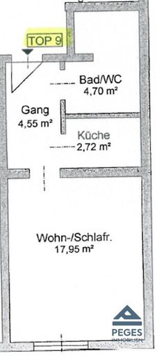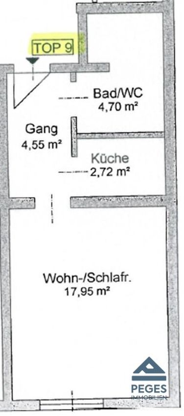 Räumliche Einteilung: Vorraum, Badezimmer (mit Dusche und WM-Anschluss)/ WC, Küche, Wohn-/Schlafraum; Kellerabteil
