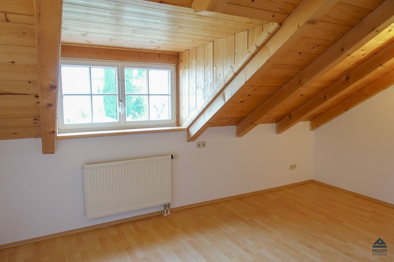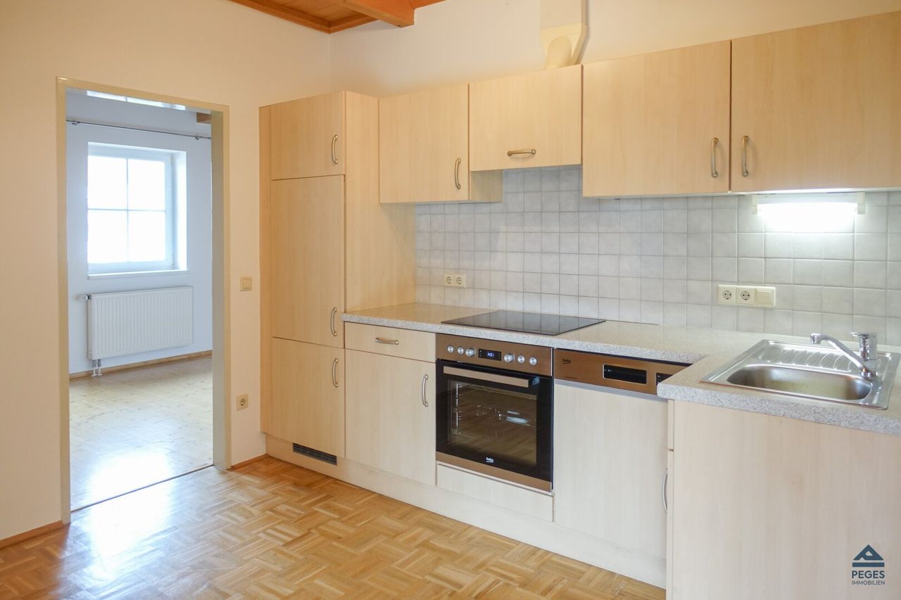 Die Wohnung mit einer Fläche von ca. 82,67 m² zuzüglich 2 Balkone mit ca. 5,82 m² bzw. 4,40 m² befindet sich im 2. Obergeschoss/ Dachgeschoss (ohne Lift). Die Wohnung befindet sich einem ordentlichen und gepflegten Zustand. Der Sanitärbereich besteht aus einem WC sowie einer Badewanne, ein Waschmaschinen-Anschluss ist vorhanden. Das offene Wohnzimmer ist mit einer Küchenzeile (inkl. Geschirrspüler, etc). Von hier aus ist auch einer der Balkone (westliche Ausrichtung) begehbar. Das Schlafzimmer (ebenfalls mit Balkon, nördliche Ausrichtung) bzw. Kinderzimmer/ Büro sind praktisch geschnitten. Die Wohnung ist in dem Wohnräumen mit einem Parkettboden ausgestattet bzw. der Badezimmer/WC-Bereich ist mit schönen, hellen Fliesen versehen. Für Stauraum sorgt ein praktischer Abstellraum in der Wohnung.