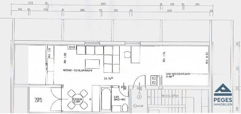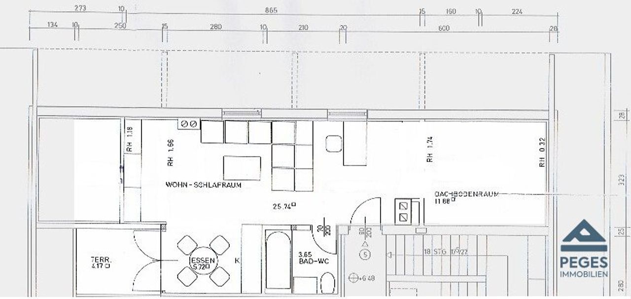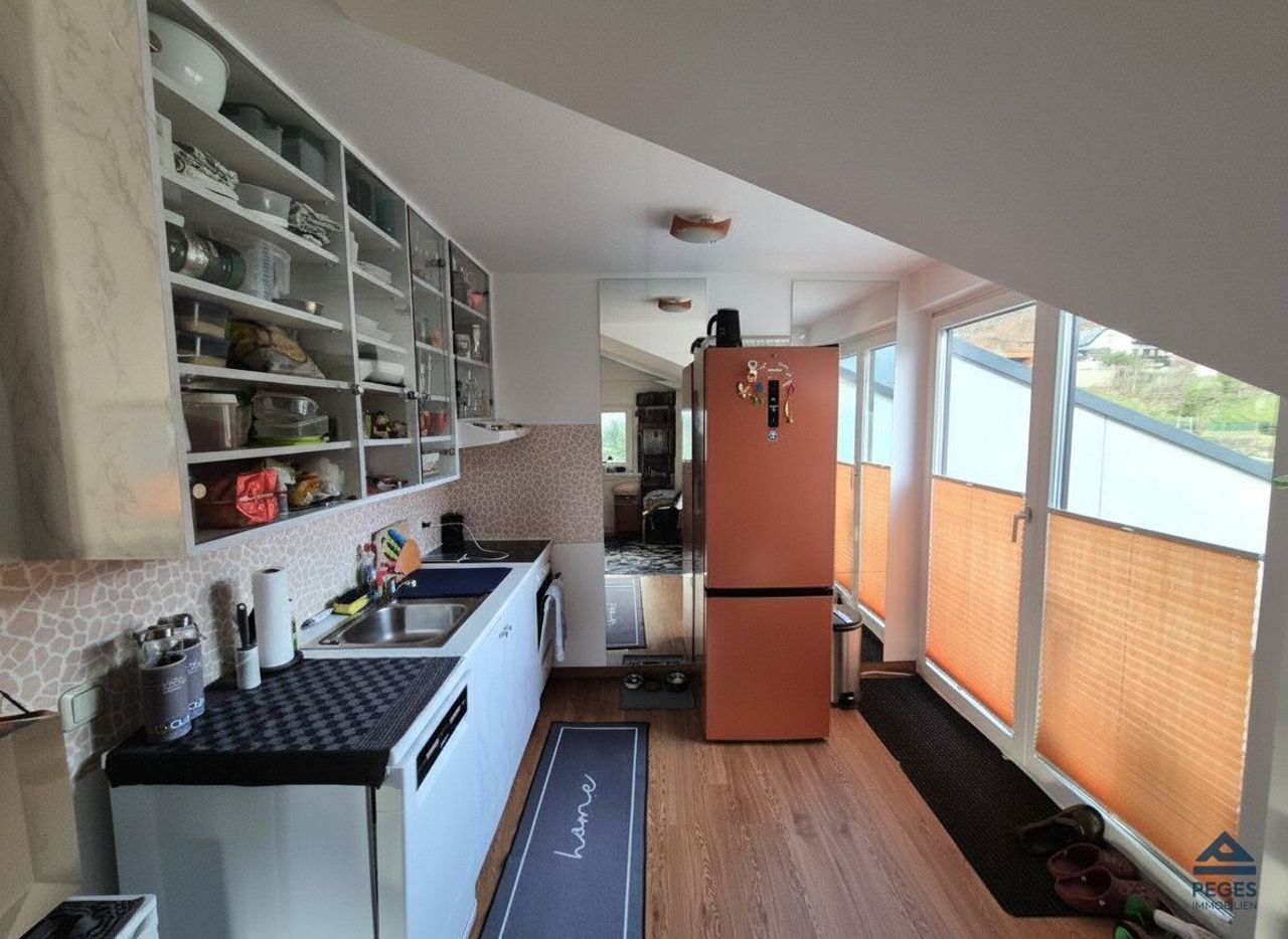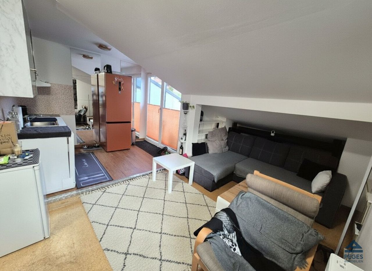 Bei Betreten der Wohnung gelangt man bereits in den gemütlichen Wohnbereich, welcher auf beiden Seiten ein von der Mansarde begrenzt wird. Diese bittet Platz für die Einrichtung des Schlafbereiches bzw. wurde diese an einer Seite mit Regaleinbauten versehen. Eine Küchenzeile (samt Geräten) ist eingerichtet. Die gemütliche Terrasse mit süd-östlicher Ausrichtung ist von hier aus begehbar und lädt zum verweilen ein. Der Sanitärbereich ist mit einer Badewanne und WC ausgestattet. Zudem befindet sich hier ein Waschmaschinenanschluss.