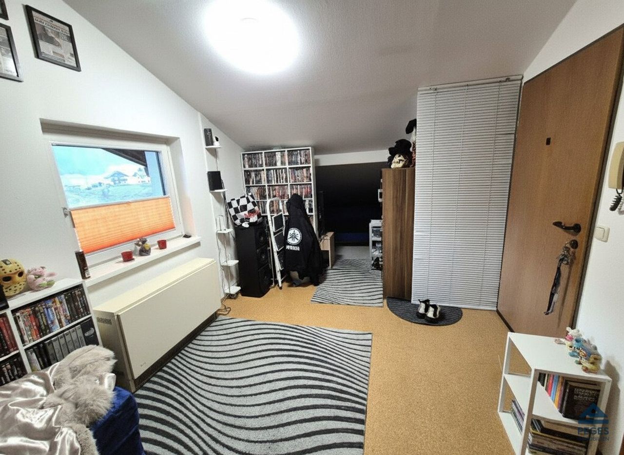Die Wohnung liegt im 2. Obergeschoss des Hauses (Dachgeschoß mit Mansarden, ohne Lift) und verfügt über ein Flächenausmaß von ca. 35 m². Ein ordentlicher und gepflegter Zustand ist gegeben. Bei Betreten der Wohnung gelangt man bereits in den gemütlichen Wohnbereich, welcher auf beiden Seiten ein von der Mansarde begrenzt wird. Diese bittet Platz für die Einrichtung des Schlafbereiches bzw. wurde diese an einer Seite mit Regaleinbauten versehen. Eine Küchenzeile (samt Geräten) ist eingerichtet. Die...